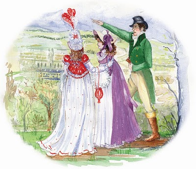 devoted three volumes, and the chief of your time, to the passions of Kitty, you might have held your own, even now, in the circulating library. How Lyddy, perched on a corner of the roof, first beheld her Wickham; how, on her challenge, he climbed up by a ladder to her side; how they kissed, caressed, swung on gates together, met at odd seasons, in strange places, and finally eloped: all this might have been put in the mouth of a jealous elder sister, say Elizabeth, and you would not have been less popular than several favourites of our time. [p. 79]