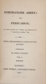 [Jane Austen]. Northanger Abbey: and Persuasion. By the Author of “Pride and Prejudice,” “Mansfield-Park,” &c. With a Biographical Notice of the Author. In Four Volumes. Vol. I. [II. III. IV.]. London: John Murray, 1818. Opening bid: $3,750. [est.$7500+]