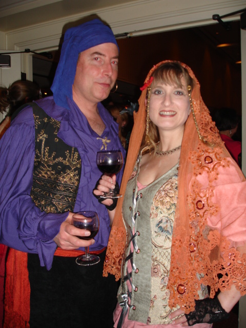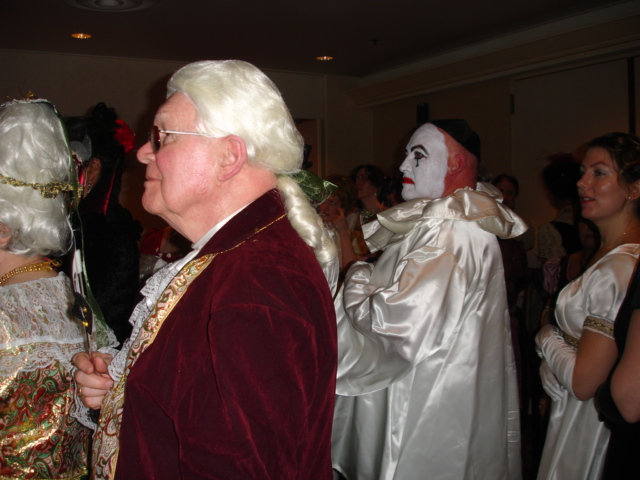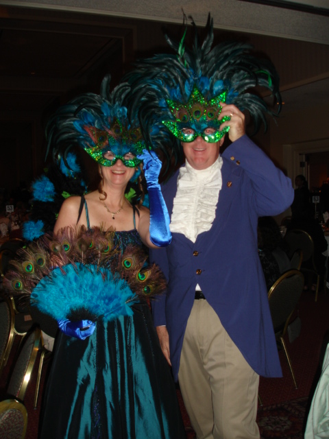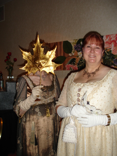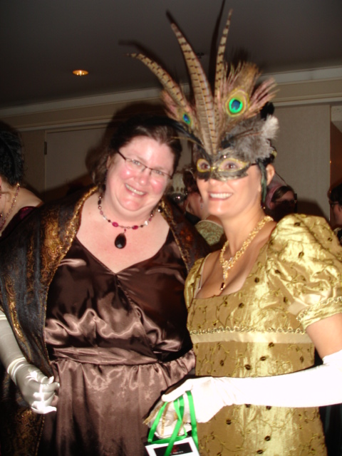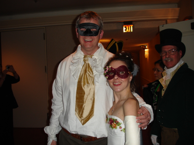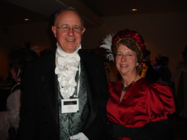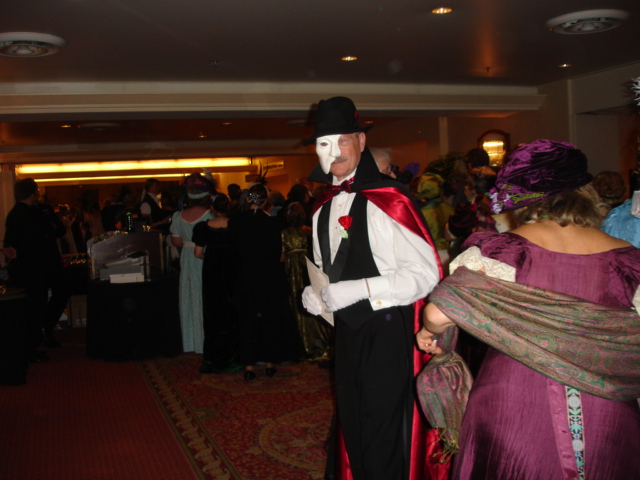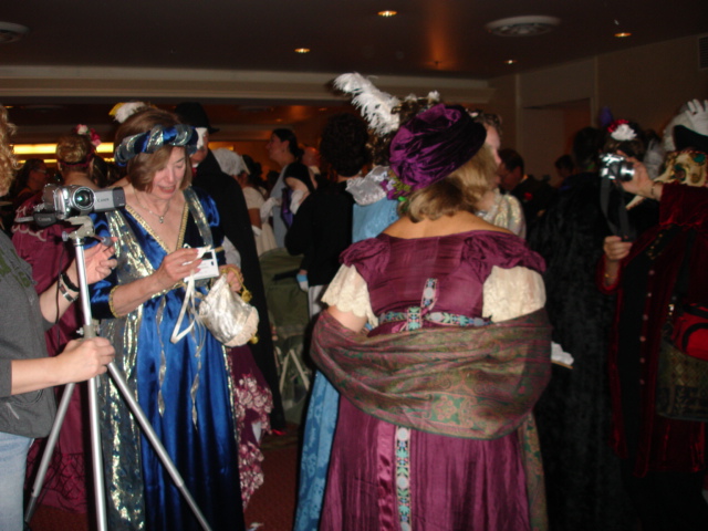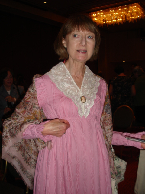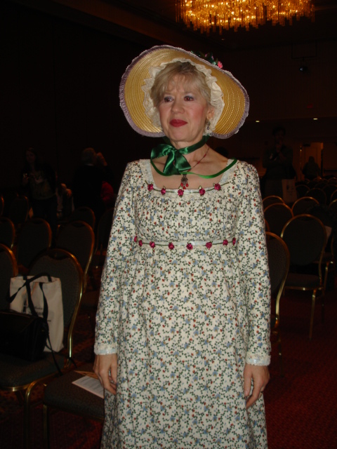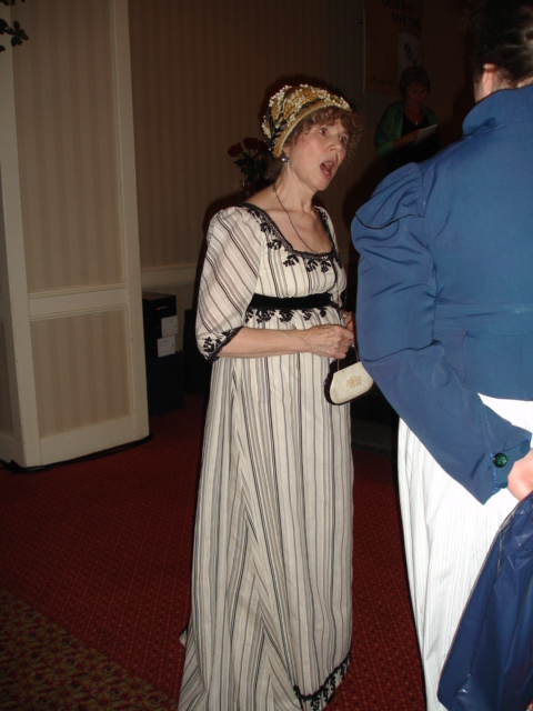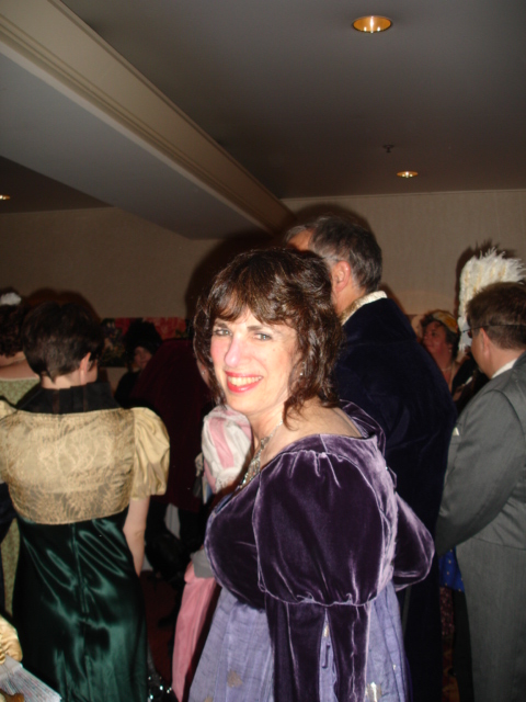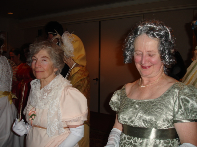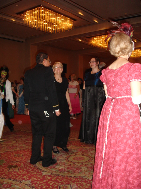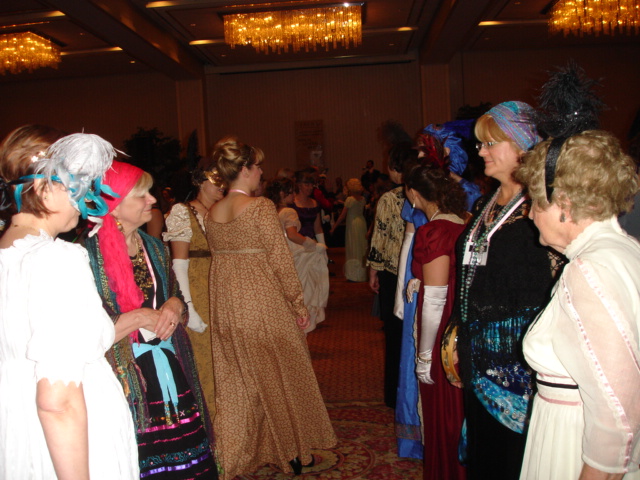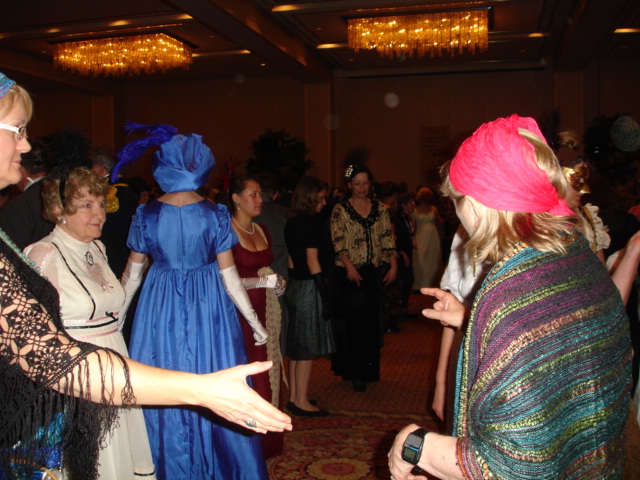 And then, the Banquet and Ball – the AGM had more fashionable Ladies and Gentlemen than I have ever seen – some elaborate Regency, some outrageous costumes for the Bal Masque – my costume still the “pattern-in-the-bag state – only a black velvet Spencer over a long dress – best I could do, but certainly not Promenade material! – which was great because I could just stand there and take pictures. Dinner was great fun – we had a fun table and met all manner of Austen bloggers and web masters: Sue Forgue of Regency Encyclopedia [contact me for passwords]; Diana Birchall of Mrs. Darcy’s Dilemma fame and her blog “Light, Bright and Sparkling”- we bonded on our “born and bred” in New York heritage; she introduced me to Ellen Moody, long known to me from the Austen listservs – I marvel at her Calendars of the novels – so great to meet her – we also bonded on our “born and bred” in New York heritage!… others across the table beyond the hollering needed to hear – will get in touch with them via email – then off to see the Promenade, a fiasco of elevator limitations, so no parading about the streets of Portland for this year – no matter, the foyer and ballroom were quite fine to exhibit the finery! pictures follow with names of those I got permission from – I did go into the Monster Mash event for a bit to hear the three different talks on the gothic – but headed back to the room for a needed respite – alas! my skills at English Country Dance to be exhibited next year! – and again, more and more people up there dancing this year – this is a wonderful trend at the AGMs – back to the sewing machine and ECD instruction for me!
