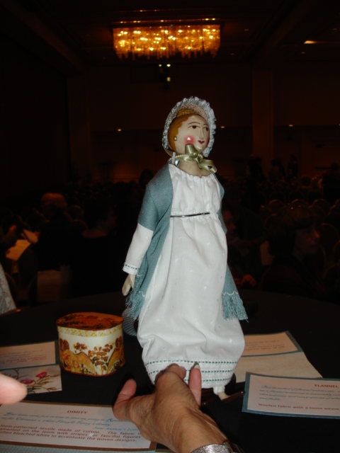 So after feeling quite confident in Catherine’s true place in the Austen canon, on to a fashion session with Mary Hafner-Laney, a specialist in construction of historic clothing in “ ‘I was tempted by a pretty coloured muslin’: Jane Austen and the Art of being Fashionable” – a presentation covering the various fashion sources in magazines, such as La Belle Assemblee, the use of fashion dolls [see illus. below] in the marketing, purchasing and sewing process, all the while citing Austen’s many references to the fashions of the day in her letters, filled as well all know with fashion gossip! and her novels. Mary took us through the process of purchasing the materials, choosing styles, finding a dressmaker, and the costs – i.e. nothing off the racks in Austen’s time! She spoke about Eleanor’s white gowns and other color options, types of fabrics and where they came from and the stores that sold them. Then a few words on undergarments, laundering, remaking and dying, and how one can never have “too much trim”! A lovely and informative talk! and now some pictures of the beautifully clad listeners: