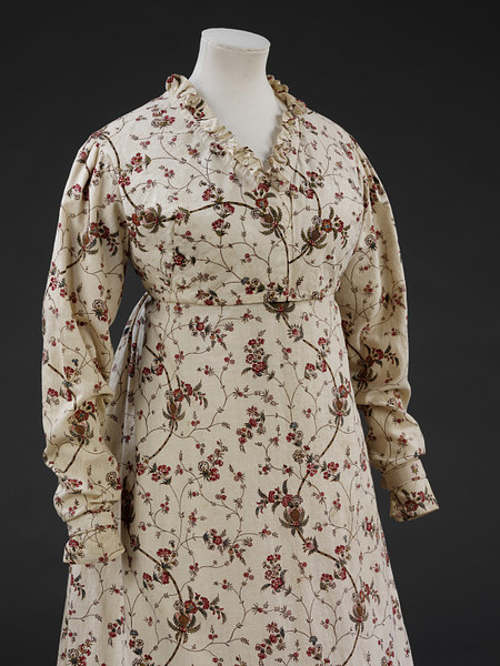 Long sleeves in women’s dress became fashionable in the 1780s, and with them, new ways of fastening and decoration at the wrists. In this very simple cotton gown from the late 1790s, the sleeve is closed with a narrow band of fabric, edged with piping, which fastens with hook and eye.