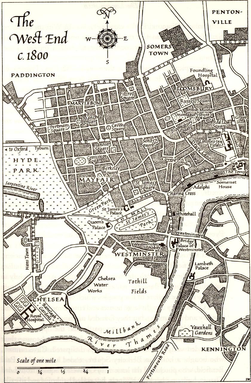 [Map image: The West End, c.1800. From Christopher Hibbert, London: The Biography of a City, 1969.]