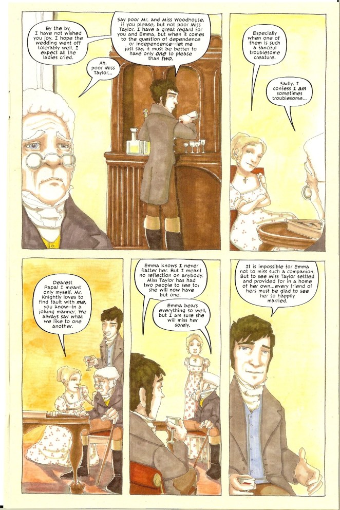 Le Faye suggests that the portrait ‘could be as early as 1818’, one year after Austen’s death. Le Faye comments: ‘This might well be a creation by the Revd William Jones (1777-1821), curate and vicar of Broxbourne and Hoddesdon – or if not him, someone with very similar interests. On 17th April 1818 Mr Jones confided to his diary: “Whenever I am much ‘taken with’ an author, I generally draw his or her likeness in my own fancy…” The artist, whoever he/she may have been, seems to have read Henry’s “Biographical Notice [of the Author”, by Jane Austen’s brother Henry in the four-volumes of Northanger Abbey and Persuasion in 1817] and invented the portrait accordingly, depicting a thin, large-nosed, well-dressed middle-aged lady set against a background of a swagged curtain, classical columns, and cathedral tower. She is sitting at a small round table, quill and notebook in hand and with eyes upraised apparently seeking literary inspiration from the heavens. The elements of the portrait are symbolic – her closely-fitting long-sleeved dress suggests sober respectability; and her various rings and necklaces demonstrate likewise that she was well off, not a poor hack writer starving in a garret. The sleeping cat on the table beside her implies spinsterhood – a pet instead of a child – and the cathedral tower in the background, vaguely reminiscent of Canterbury, harks back to Henry’s statement in his last paragraph that “She was thoroughly religious and devout.”‘