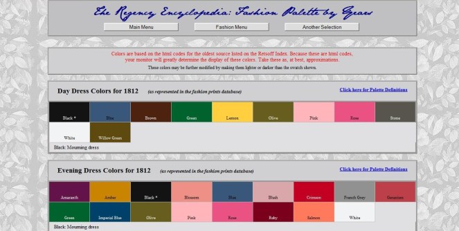 SF: The Dress the Doll feature was something I’ve wanted to do from the beginning and did have to wait for the right time both because of the programming to achieve it and I felt there were more pressing projects that needed to be launched first such as the Map Module. However, as I said, this has been a priority from the beginning but as there are already a few very fine websites where you can play around and have a lot of fun doing it, I didn’t know how historically accurate the colors chosen were or if the garments were just copied from the movie adaptations. Since I had a huge database of prints given to me in 2009, the time was then right to explore that ready-made gold mine of information. The more I catalogued, the more curious I became about what exactly morone or hessian green looked like and the grand search commenced to find something that showed me what those colors were. Still haven’t found that ultimate source but I did the best I could with the html codes for the color swatches.