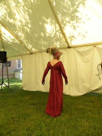 More fashion was to come as I attended Betsy Bashore’s fashion show in the large tent. Her creations are magnificent and all taken from either extent garments or pattern books of the era, ranging from mid-1790’s to about 1820. I learned a great deal in addition to just admiring the look – of bonnet veils, and cartridge pleats, and apron dresses and the like. And the fabrics – many of them from saris – were exquisite. It inspired me to continue with my own novice efforts. (My own gown that day included an overdress that I’d made from a $5 thrift shop tablecloth – hey! It worked!)