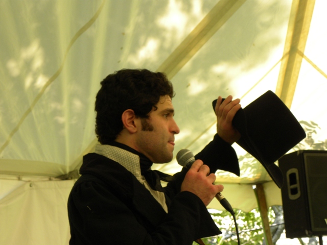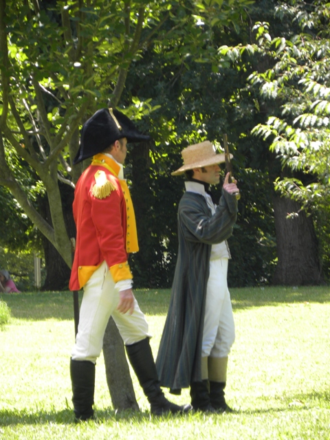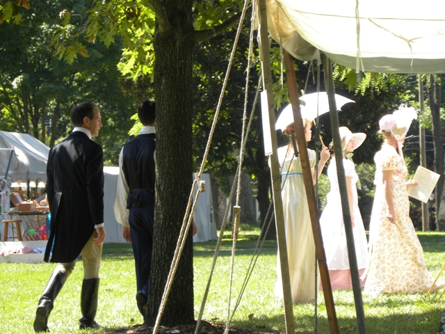 Well sated with sandwiches, scones and desserts (I agree with Melody, the lavender cake was delicious) we headed off to watch Mr Darcy undress. What better entertainment for ladies on a lazy summer afternoon! And judging by the crowd under the tent-top, I wasn’t alone in that opinion. Along the way to it we admired (and photographed) scores of wonderful Regency attire; of course, stopping to chat with ladies and gents alike about the construction of them (being a novice at making my own, I was most interested.) Brian Cushing (aka Mr Darcy) had an engaging presentation style as he peeled off his layers and his anecdotes were both humorous and instructive. A long collective chuckle rippled through the audience as he began to pull his shirt-tail out from his breeches to show us a typical shirt of the period… and it kept coming and coming. In the end it reached past his knees… as he asserted that this was one of the shorter ones of the day!