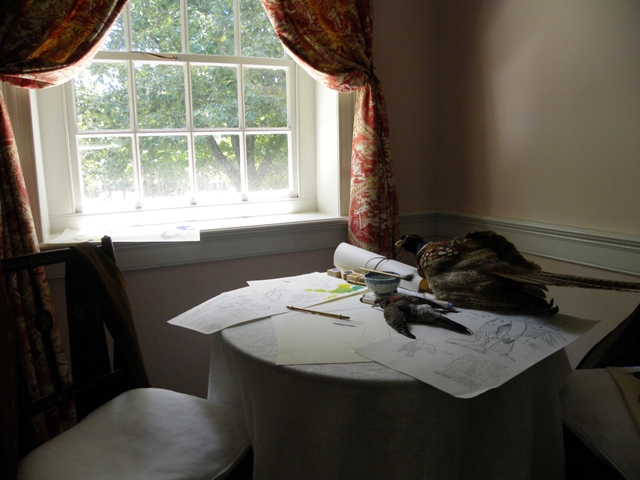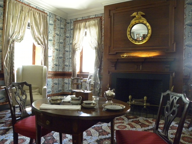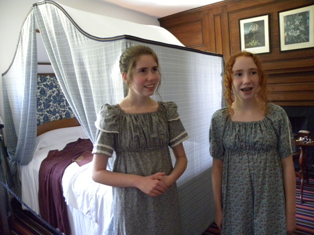 While my friends attended tea again, I instead toured the inside of the house that Melody has already described so nicely. And in addition to the house and furnishings themselves, I truly enjoyed the fashions on display there – all part of Gayle Simmons’s collection and complete with accessories of every sort. Every room held a few ensembles, either on models or lovingly spread out on beds awaiting some young lady to prepare for a ball. Very impressive in all. Each room was manned by a volunteer to provide visitors with a short history, and the master bedroom in particular had a pair of girls who explained that they were in their parents’ room looking for a ribbon their younger brother had impishly hid from them, a particular one the older girl wanted to wear for her coming out. They stayed ‘in character’ throughout and were a delight.