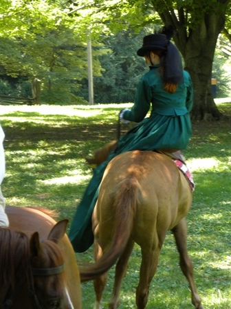 Following this, I enjoyed a demonstration of side-saddle riding from Ms Deborah Glidden and her assistants. The older gentleman (Bill Glidden) turned out to have spent a long career in Hollywood; he was Doug McClure’s riding double in The Virginian among other things. A few of us in the audience were of an age to recall that TV series very well.