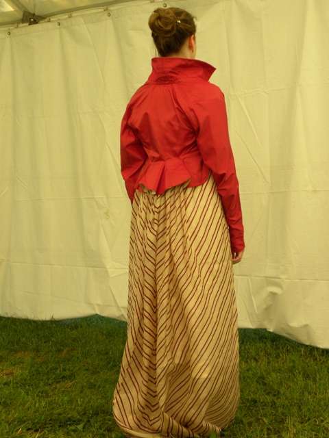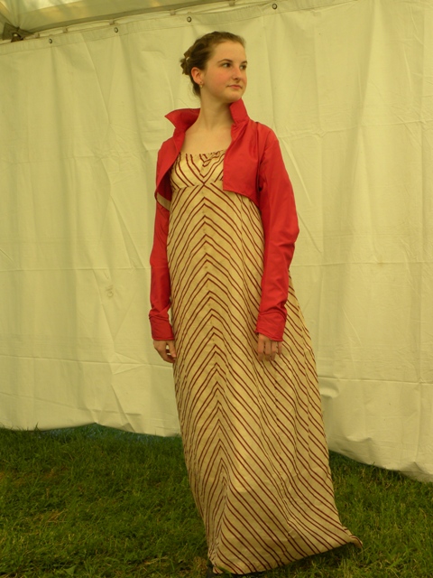 I loved all the gowns – the details in them amazing – but my favorites were this brown and cranberry silk ensemble from 1796 (coincidentally, the period I write); and this tissue-silk in a red stripe that was cut on the bias so that the striping was diagonally oriented. They both had the most delicious flow and drape when the young ladies walked. I could just imagine that taking a turn about the room in one of these would turn Caroline Bingley green with envy (as well as capture the admiring eye of Mr Darcy.)