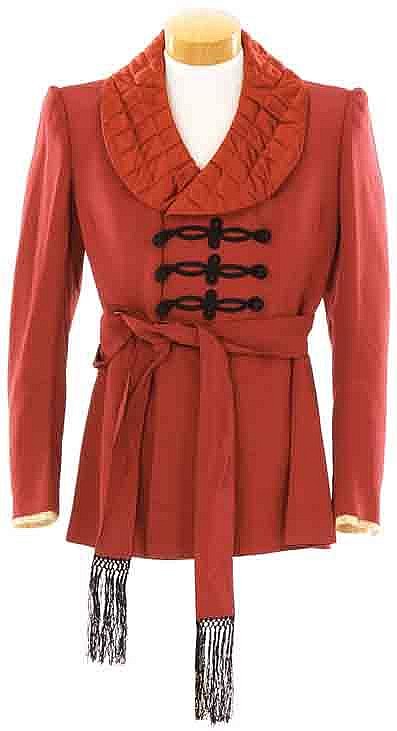 A beautiful smoking jacket, screen-worn by Laurence Olivier as “Mr. Darcy” in the epic film adapted from the classic Jane Austen novel, Pride and Prejudice. Consisting of crimson, corded silk jacket with wide quilted satin lapels, black braid brocade loop and cloth-covered button front closure, integral sash with black fringed ends, crème-colored pleats peeking from sleeve cuffs and dark maroon satin lining throughout. MGM internal bias label on inside collar with “Larry Olivier” handwritten in black ink. This striking costume exhibits barely detectable age and wear. Fabric remains fresh with colors vibrant. Overall in vintage fine condition.