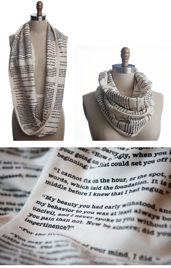 Wrap up with a good book. Our Pride and Prejudice infinity scarf is hand printed on both sides with the text from classic novels. Hand cut, sewn and silkscreened (with non-toxic inks) in the U.S.A on 100% cotton. Inking variations are inherent to the hand-silkscreen process. 65″ circumference. Ours exclusively! Price: $49.95. Availability: Will be available for shipment January 6.