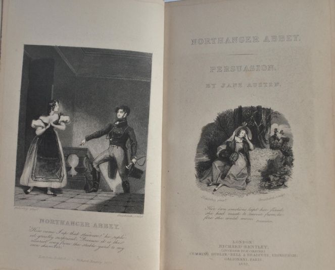 Richard Bentley purchased the copyrights of Austen’s novels from Henry and Cassandra in 1832 (and the copyright of P&P from Thomas Egerton) and in 1832-33 he published all the novels in his Standard Novels series. These were the first English editions to carry illustrations – steel-engraved frontispieces and title page vignettes by William Greatbatch after George Pickering. Northanger Abbey and Persuasion were published in 1833 in a single volume together with the frontispiece from Northanger Abbey (Henry coming up the stairs surprising Catherine) and the title vignette from Persuasion showing a seated Anne overhearing Capt. Wentworth talking to Louisa Musgrove. All very Victorian!