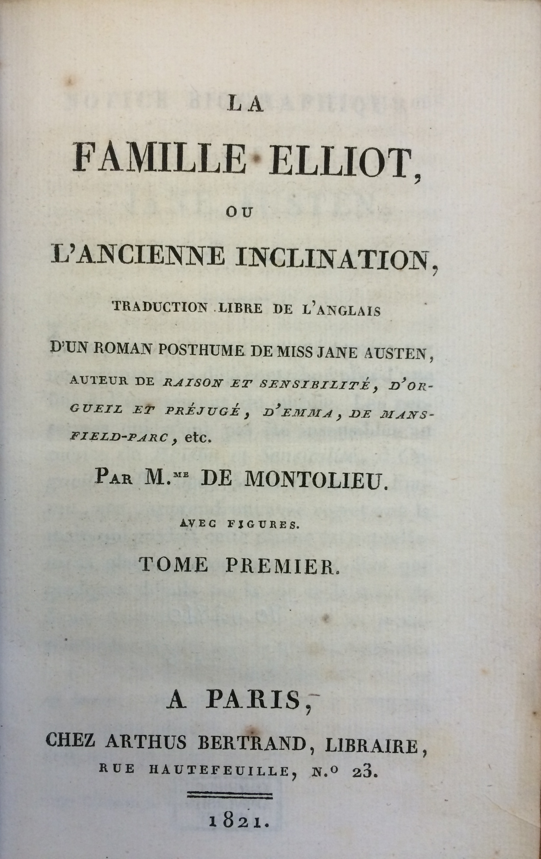 The French texts of Austen’s novels, what Southam calls “travesties not translations,” (26) were modified to fit the tastes of the sentimental French reading public. In Persuasion, Montolieu changes the ending by restoring Anne to Kellynch rather than leaving the future of Capt. Wentworth and Anne dependent upon a lasting peace. (See Cossy, 176) One notable change (and why we might ask!), is that Anne’s name is changed to Alice!
