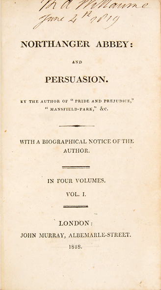 – Published by John Murray, London; 1818; in four volumes: the two Northanger Abbey volumes printed by C. Roworth; the two Persuasion volumes by T. Davison of Lombard St.