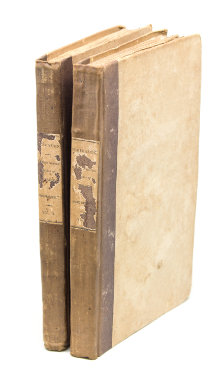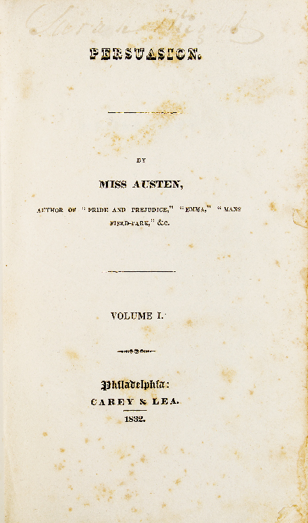 Persuasion was published in America by Carey & Lea of Philadelphia in two volumes in 1832, separate from Northanger Abbey which was published in two volumes in 1833. The title page states “by Miss Austen, Author of ‘Pride and Prejudice,’ ‘Emma,’ ‘Mansfield-Park,’ etc.” Bound in drab paper boards with purple cloth spines with white spine labels, the spine reads: “Persuasion, by Miss Austen / Author of Pride and Prejudice.” 1250 copies were printed, and advertised on November 8, 1832 as “Persuasion, a novel, by Miss Austin [sic]” as being published that day. (And people have been getting it wrong ever since!) Gilson points out the various modifications to language typical of all the American editions of Austen’s novels, mostly those having to do with the Deity, for instance “Lord bless me!” is changed to just “Bless me!”