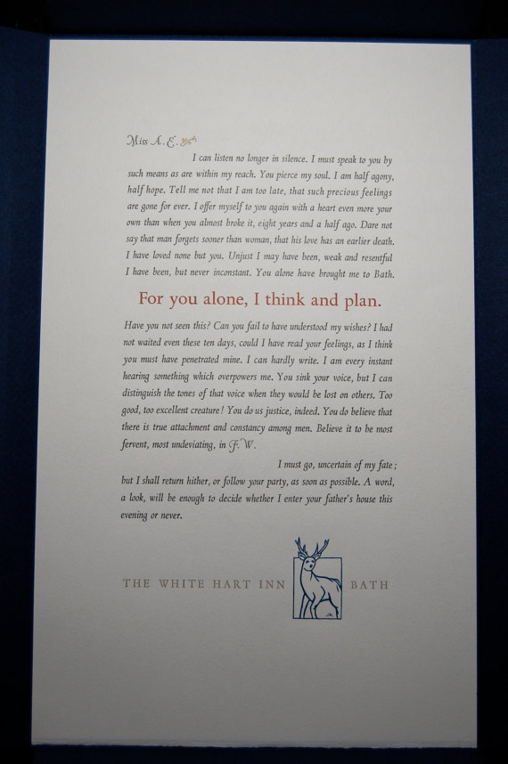 And then, The Letter – a quick conversation that Wentworth overhears, Anne having her last chance to tell him what she feels, and Wentworth leaving hastily written letter for Anne [or anyone else] to see – one is pleased to hear some of the letter verbatim [the best love letter in all of literature! – it deserves a reading!] – but then we have another Olympic Anne, running through the streets of Bath, frantically searching for her Captain – this a nod to the ridiculous Anne in the 2007 Persuasion, Sally Hawkins hysterical back-and-forth sprinting in search of her Captain – but I missed the quiet coming together of Amanda Root and Ciaran Hinds in the crazed streets of Bath, their un-Austen-like Kiss rocking the Austen world as completely inappropriate, but delicious nonetheless…