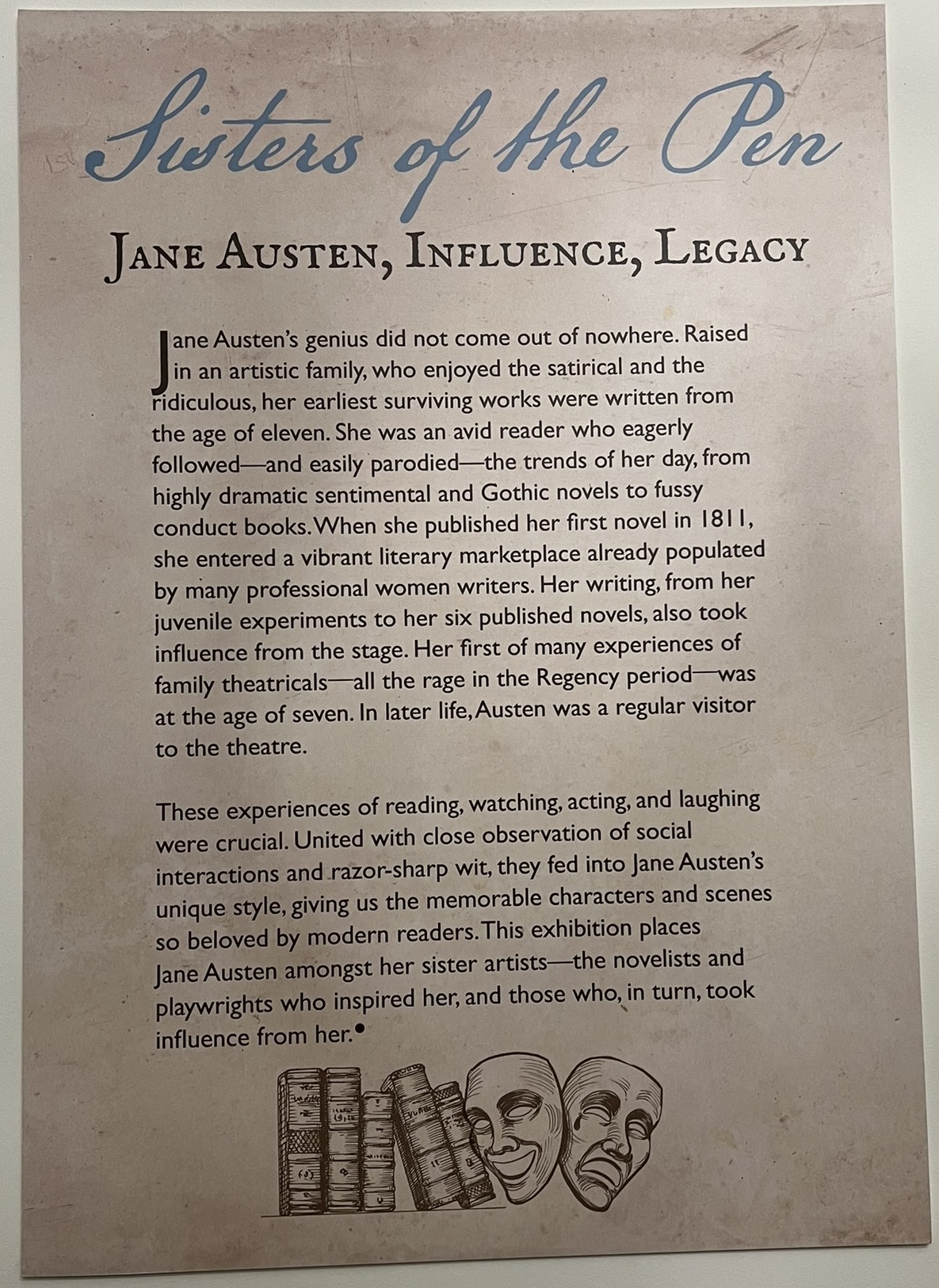 The current exhibition is quite eye-opening, especially if you were not previously aware of the numerous women writers before and during Jane Austen’s time [spoiler alert: Jane Austen did not invent the novel as we know it, nor was she the only woman writing in the late 18th / early 19th century!] – it is called “The Great Forgetting” – the removal of 100s of women writers from the canon, now subject to the ongoing process of being recovered – this exhibition “Sisters of the Pen: Jane Austen, Influence, Legacy” tells this history with both signboards, objects and books – it is beautifully done and no way to quite capture it with random photos – here are a few to give you a sense: