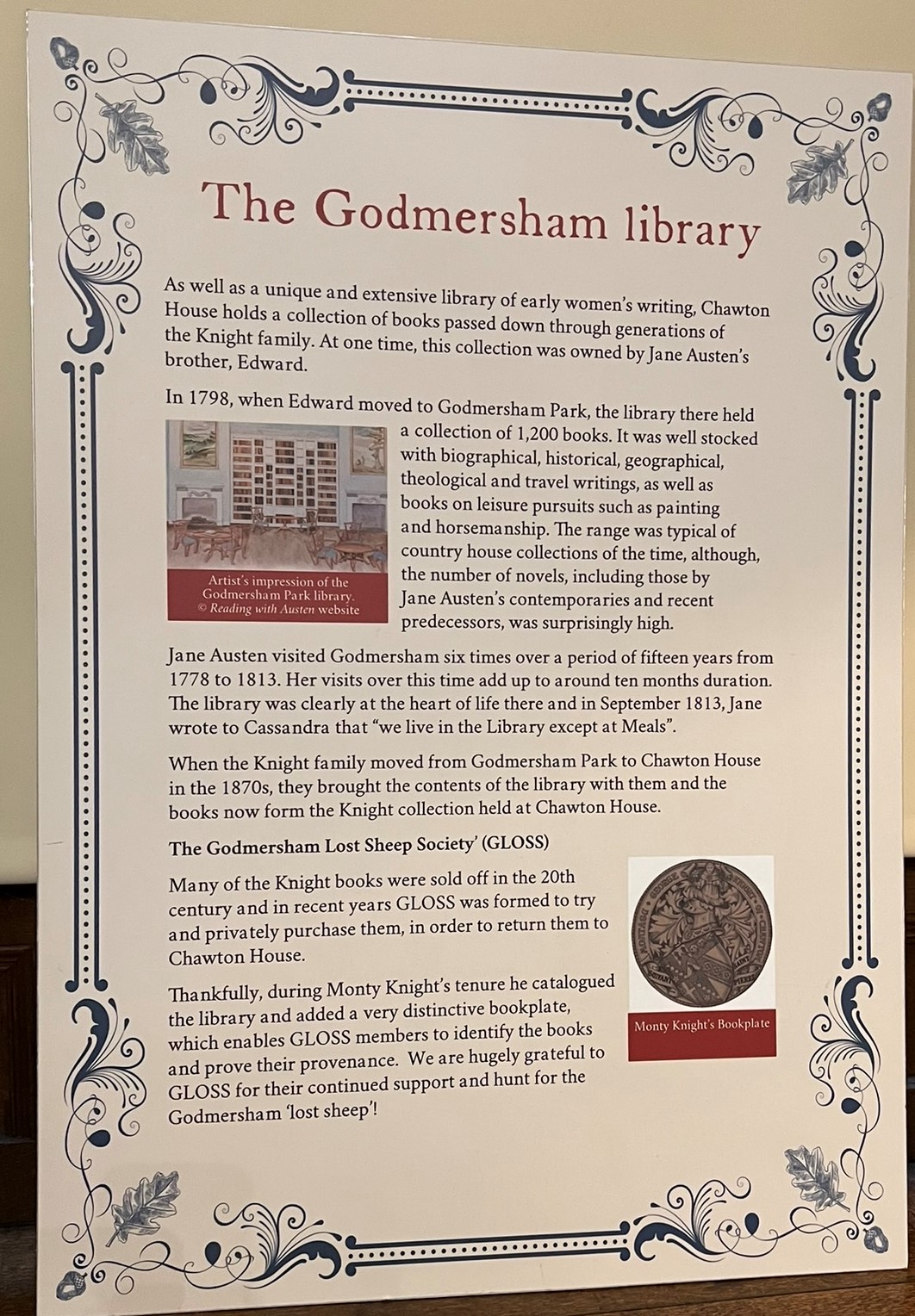 It was nice to see the display on the Godmersham Park library and the Reading with Austen website and the blog which tells of the GLOSS finds: “Bulstrode Peachey”, one of the volunteers, was very happy to tell me all about it, and even happier to learn I worked with Peter Sabor in returning the “Lost Sheep” to Chawton House: