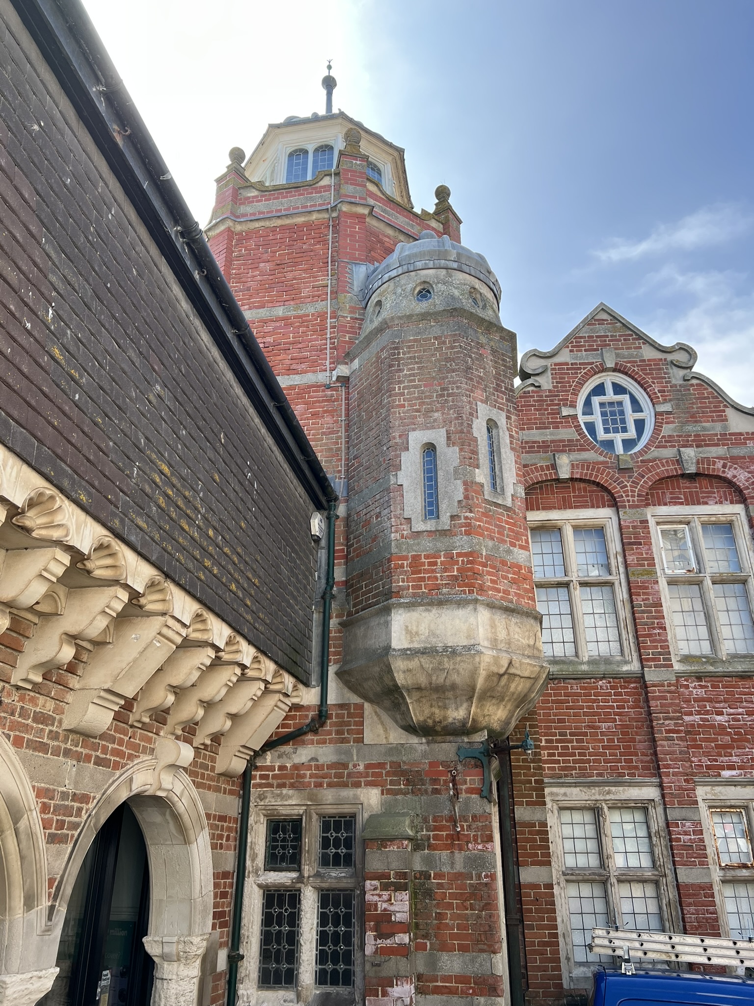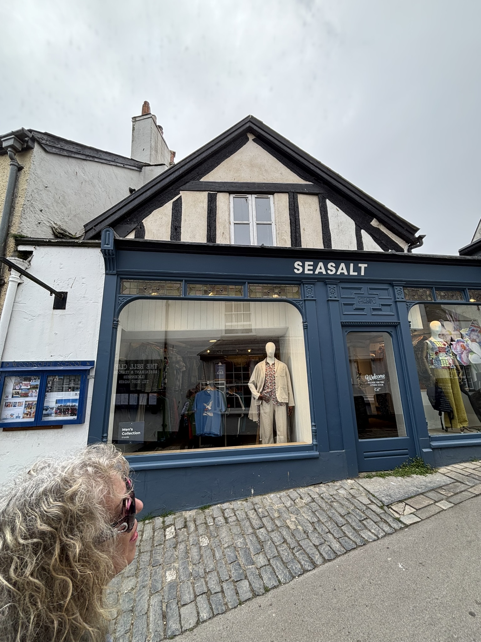 Then we walked around town in our limited time here, in pursuit of the Anning statue, had lunch at a delightful restaurant, Rock Point, sitting outside on this now sunny day [still hazy…]