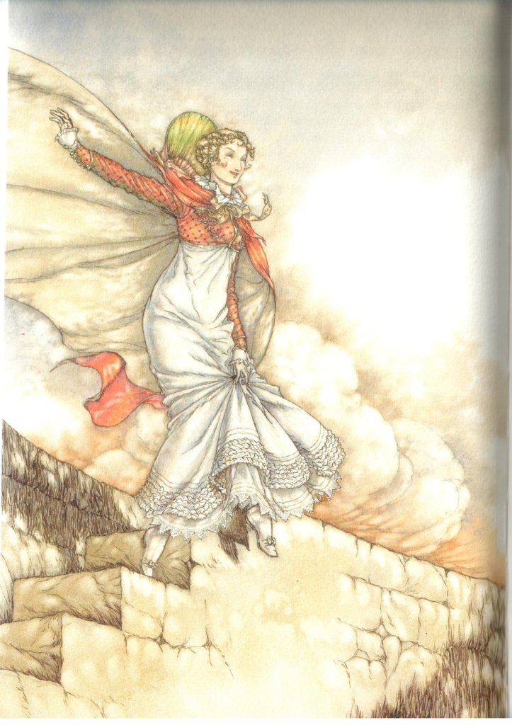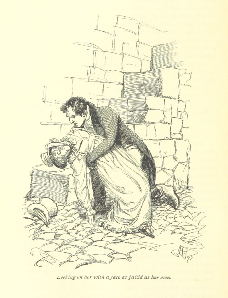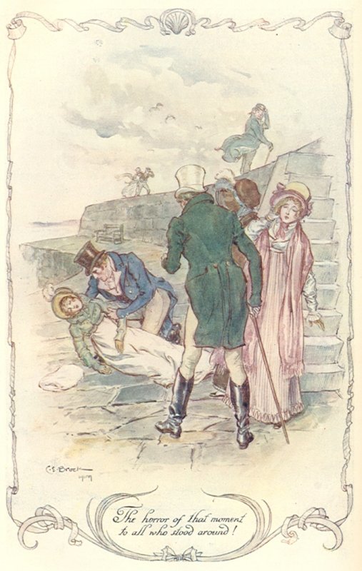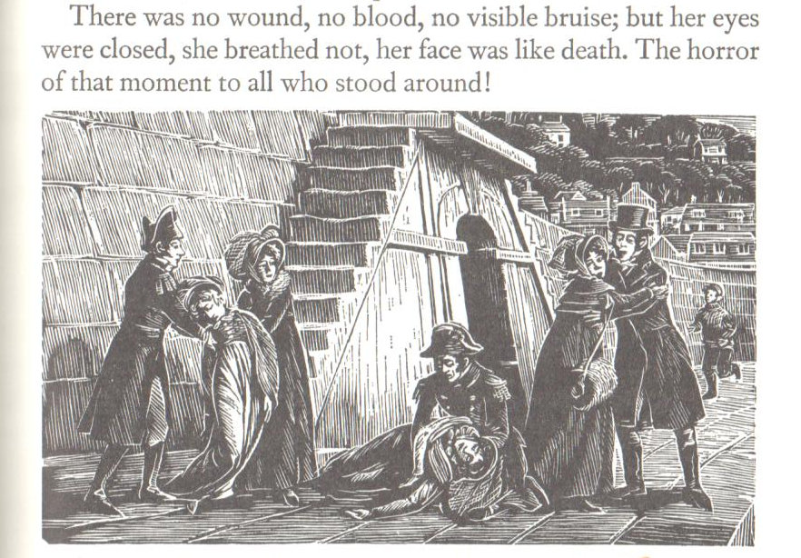 Illustrators of Austen’s Persuasion went wild with this scene, showing both options in their drawings: do you show her jumping?, or lying “lifeless” on the ground, Wentworth pleading “Is there no one to help me?” – here are just a few: