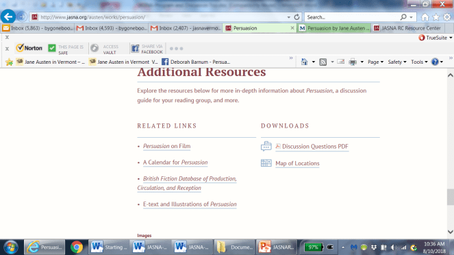 -When you are reading / re-reading an Austen title, start with the JASNA website for resources and discussion questions – for example, here is a link to the Persuasion page on JASNA; and specifically the discussion questions here; and see also the abundant essays in Persuasions.