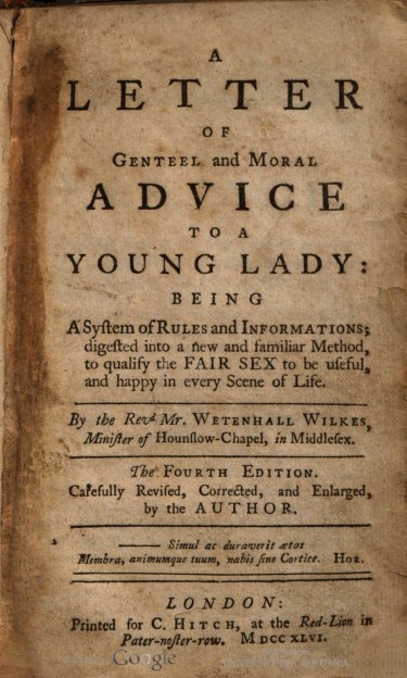 Rev. Wetenhall Wilkes. A Letter of Genteel and Moral Advice to a Young Lady: Being a System of Rules and Informations: Digested Into a New and Familiar Method, to Qualify the Fair Sex to be Useful, and Happy in Every Scene of Life. London, 1746. Another conduct book.