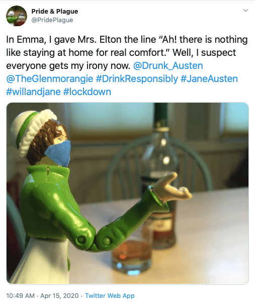 As noted above, Janine is currently working through the present sheltering-in-place crisis by finding daily humor in the antics of Jane and Will and posting all about them on her twitter page “Pride & Plague.” You can follow the fun here: https://twitter.com/PridePlague
