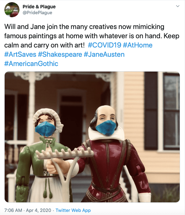 JB: I would like folks to know of my unexpected lockdown project: “Pride & Plague” on Twitter (@PridePlague). On this channel celebrity couple William Shakespeare and Jane Austen have been posting updates to their fans while in social isolation during the COVID-19 crisis. Even those not on Twitter can see it here for a chuckle: https://twitter.com/PridePlague. I think of this project as my contribution to morale [and a welcome contribution it is! See below for some examples…]