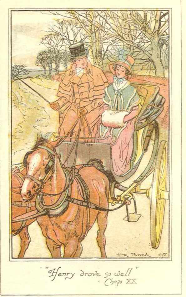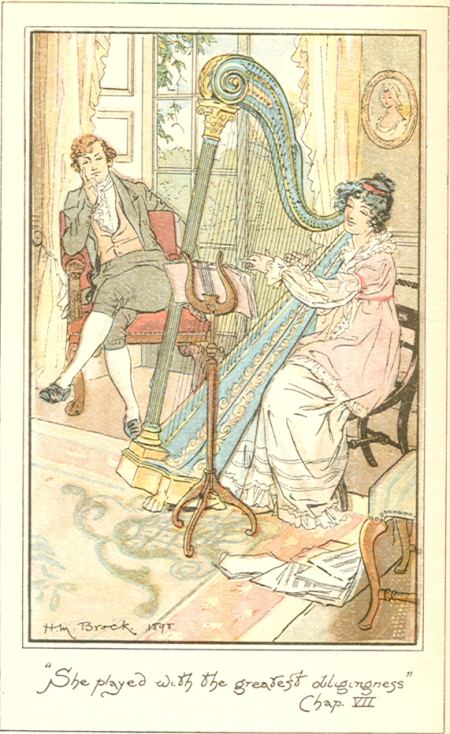 The Brocks are most often compared with Hugh Thomson: there are various critical interpretations of these two most popular Austen artists, some more approving of Thomson’s humor and his almost caricatured characters, while others preferring the more effective facial expressions and body language of the Brocks that seem more realistic despite the rather overdrawn borders and settings – do notice the detail in the fashion, the furnishings, and landscape, and what scenes are chosen – we can compare these to Thomson in future posts. The point is, you need them both…
