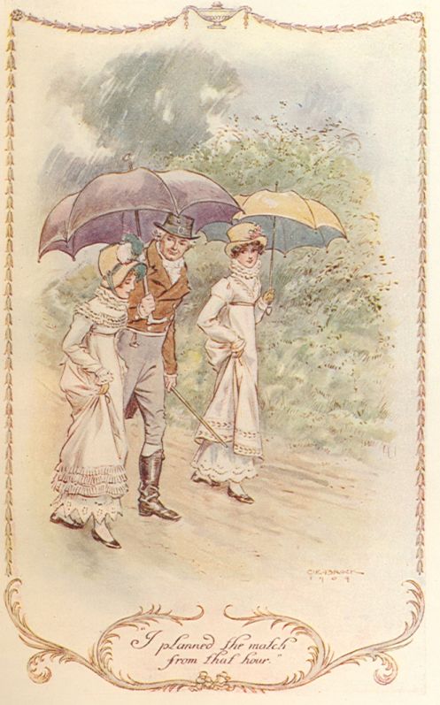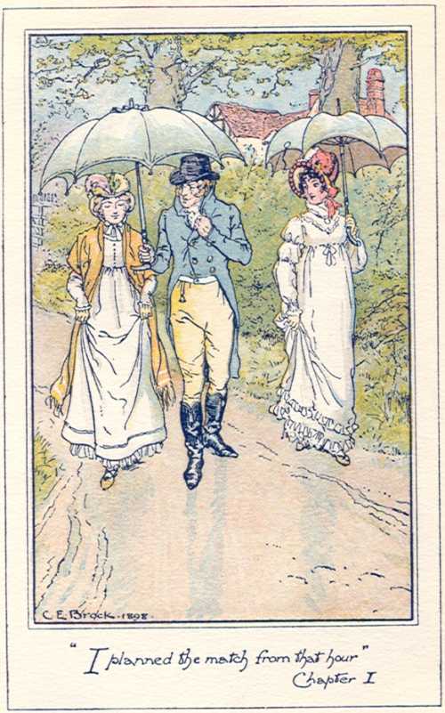C. E. Brock had previously illustrated Pride and Prejudice with black and white line drawings – this was published by Macmillan in 1895. He would go on in the years 1907-09 to illustrate all the novels for another Dent publication, their Series of English Idylls (with 24 watercolor illustrations in each volume; they were all later published as a set with fewer illustrations in each volume.) To compare CE Brock’s two very different styles in these two editions is an interesting way to spend at least an afternoon! Here is one example from Emma, the infamous romance-inducing umbrella scene: