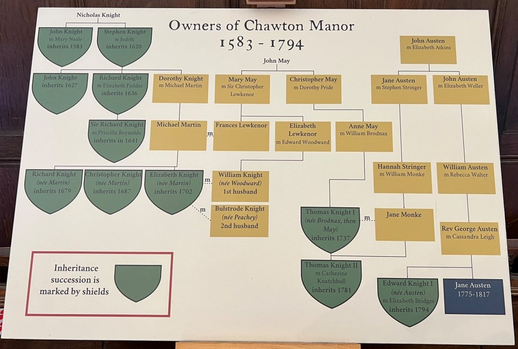 Chawton House is an Elizabethan manor house still in the Knight family, owned by Edward Austen Knight, Jane Austen’s brother. Edward was adopted by the Knight family and he inherited three estates: Steventon, Chawton and Godmersham Park. You can read all this interesting history here – https://chawtonhouse.org/visit/house/