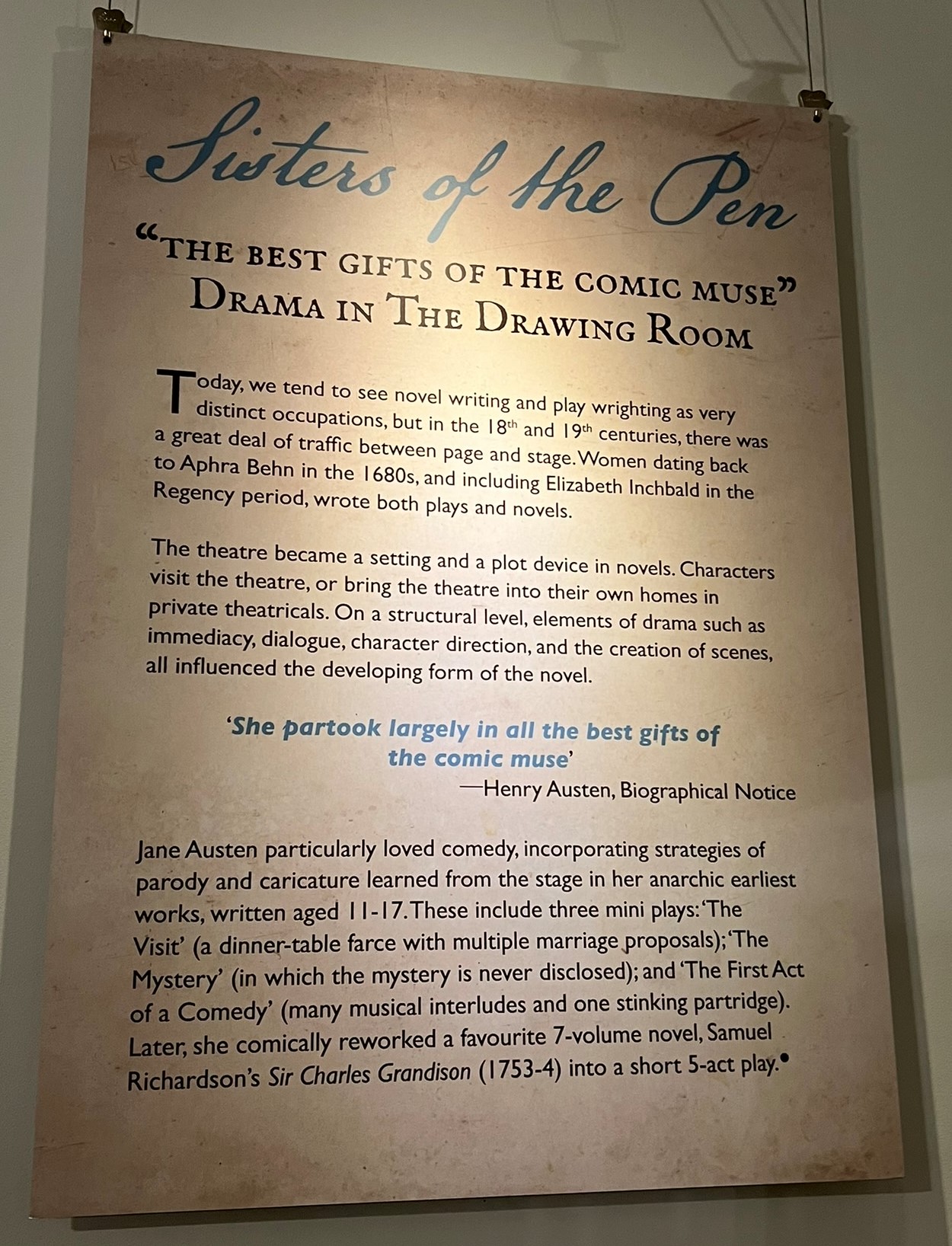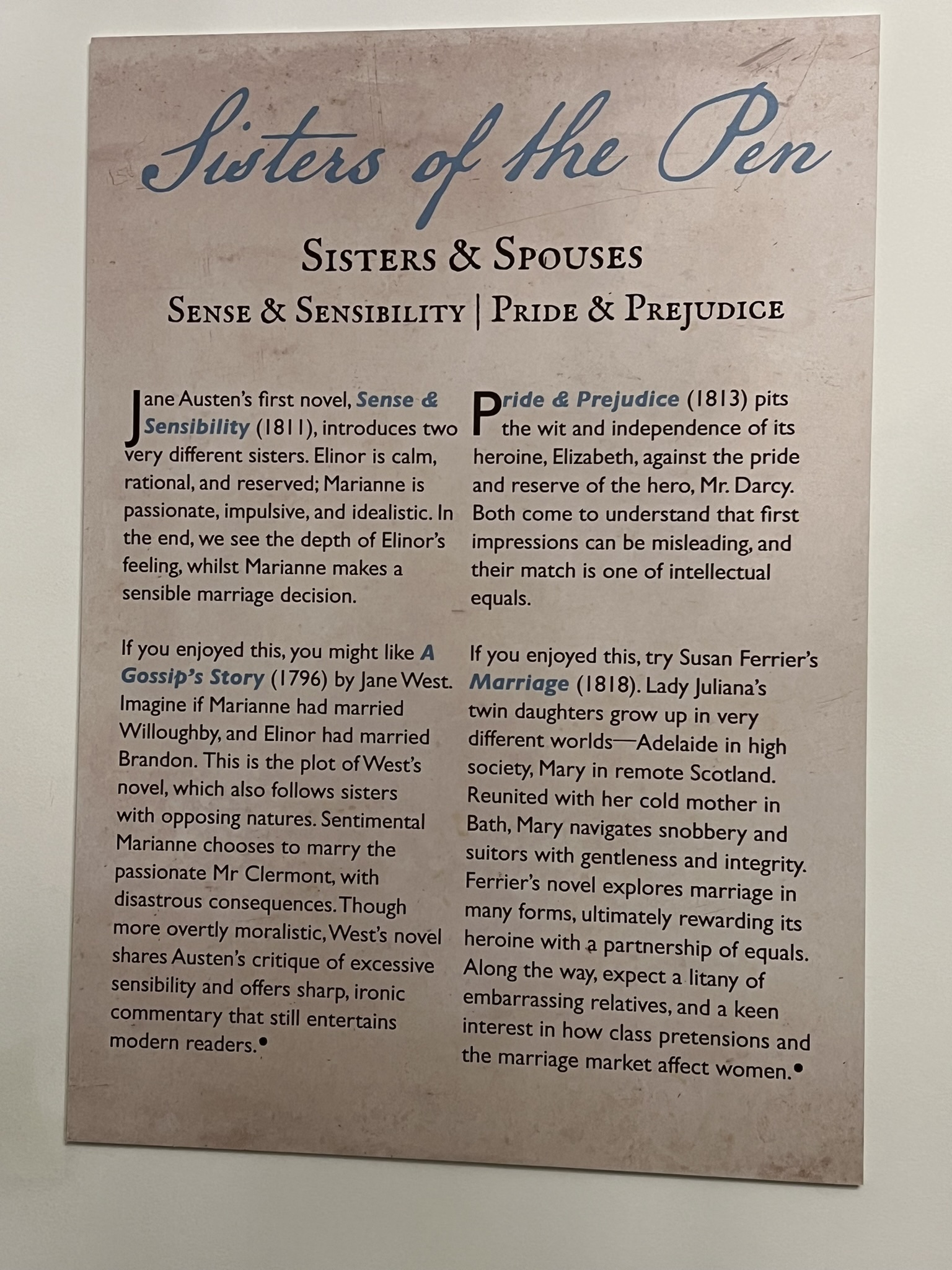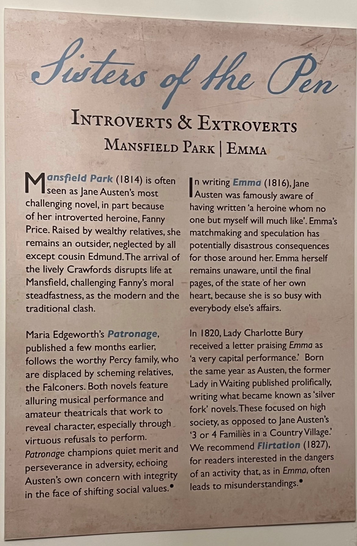 The current exhibition is quite eye-opening, especially if you were not previously aware of the numerous women writers before and during Jane Austen’s time [spoiler alert: Jane Austen did not invent the novel as we know it, nor was she the only woman writing in the late 18th / early 19th century!] – it is called “The Great Forgetting” – the removal of 100s of women writers from the canon, now subject to the ongoing process of being recovered – this exhibition “Sisters of the Pen: Jane Austen, Influence, Legacy” tells this history with both signboards, objects and books – it is beautifully done and no way to quite capture it with random photos – here are a few to give you a sense: