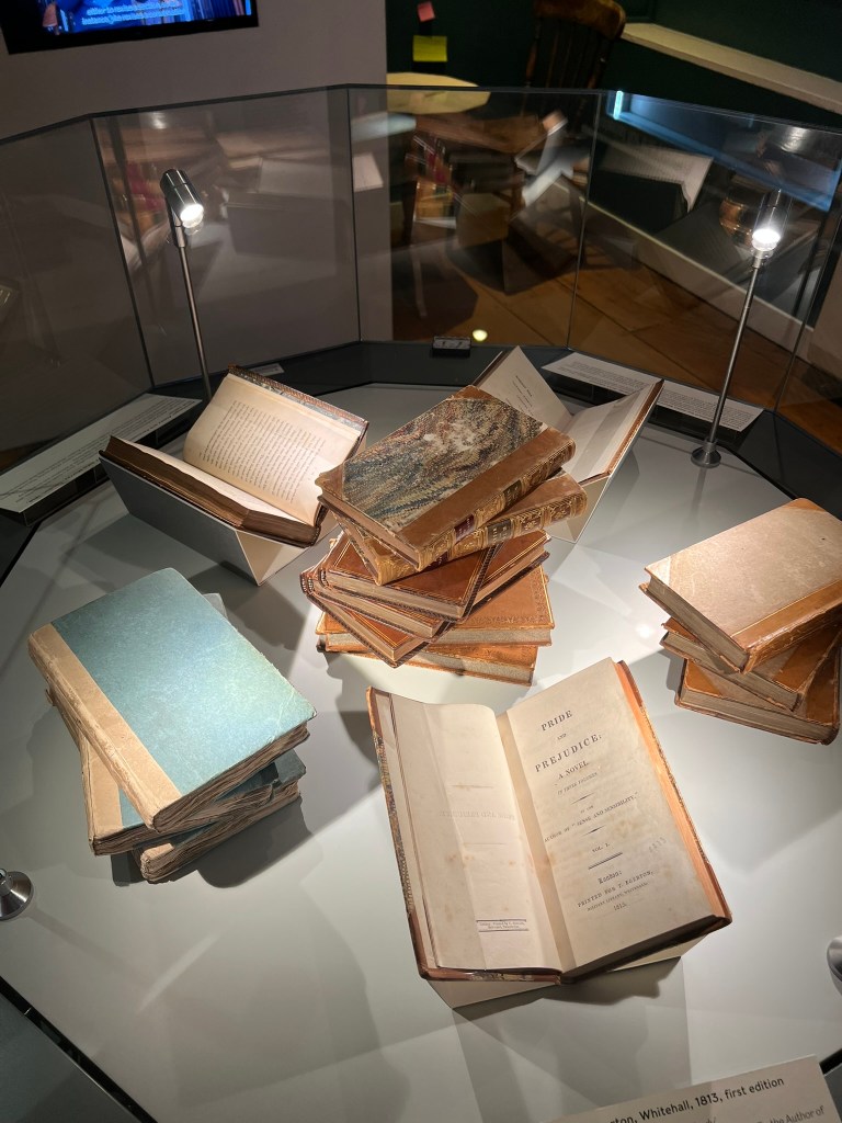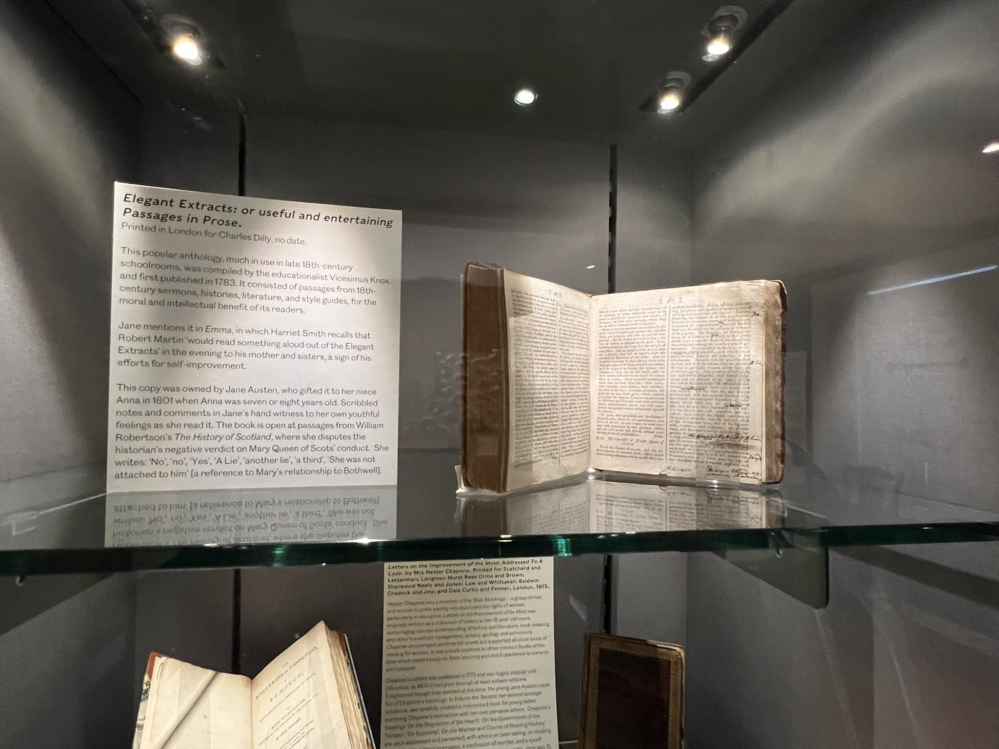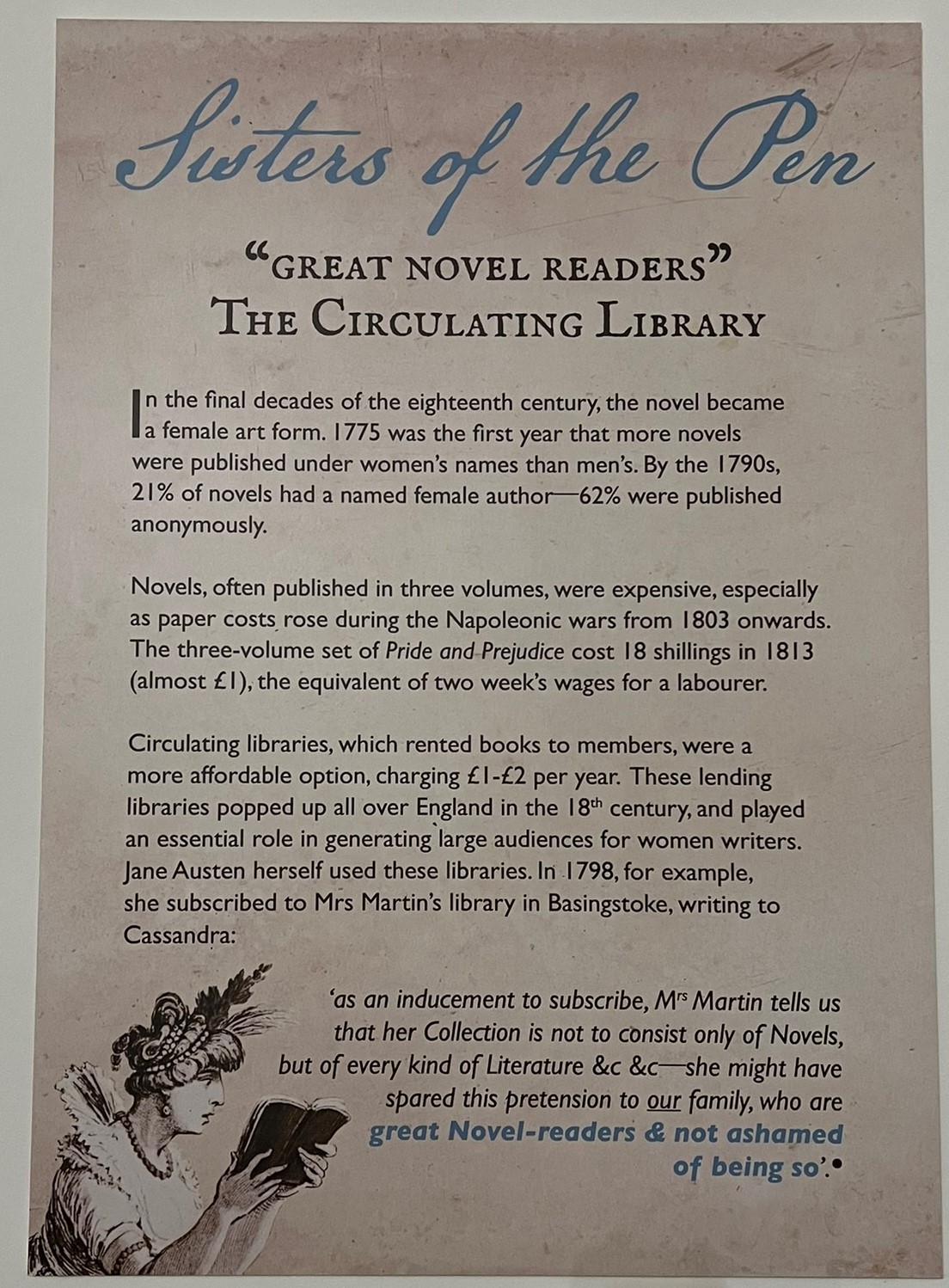 The current exhibition is quite eye-opening, especially if you were not previously aware of the numerous women writers before and during Jane Austen’s time [spoiler alert: Jane Austen did not invent the novel as we know it, nor was she the only woman writing in the late 18th / early 19th century!] – it is called “The Great Forgetting” – the removal of 100s of women writers from the canon, now subject to the ongoing process of being recovered – this exhibition “Sisters of the Pen: Jane Austen, Influence, Legacy” tells this history with both signboards, objects and books – it is beautifully done and no way to quite capture it with random photos – here are a few to give you a sense:
