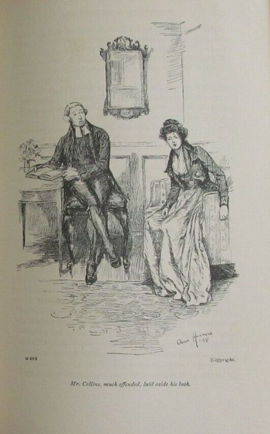 By tea-time, however, the dose had been enough, and Mr. Bennet was glad to take his guest into the drawing-room again, and, when tea was over, glad to invite him to read aloud to the ladies. Mr. Collins readily assented, and a book was produced; but, on beholding it (for everything announced it to be from a circulating library), he started back, and begging pardon, protested that he never read novels. Kitty stared at him, and Lydia exclaimed. Other books were produced, and after some deliberation he chose Fordyce’s Sermons. Lydia gaped as he opened the volume, and before he had, with very monotonous solemnity, read three pages, she interrupted him with: