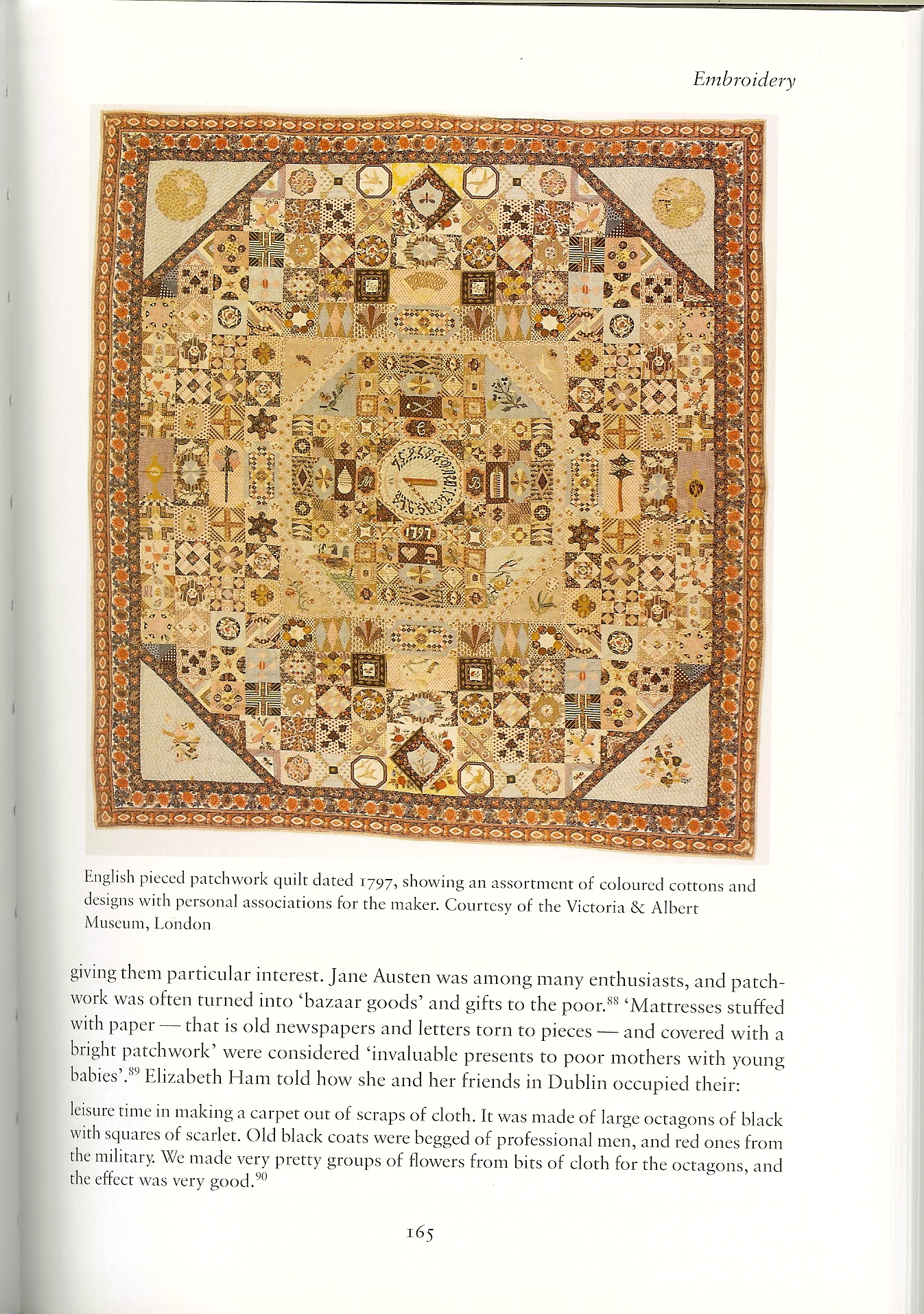This image of page 165 quotes Austen about patchwork when she writes to Cassandra on 31 May 1811:“Have you remembered to collect peices for the Patchwork?”