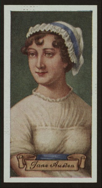 *Another image of Jane! A cigarette card from the NYPL Digital Gallery, from a collection of 50 cards of “Celebrities of British History” – here is the Jane Austen card and the verso with a short biography of Austen. You can see her illustrious company on the 49 other cards at the link below:
