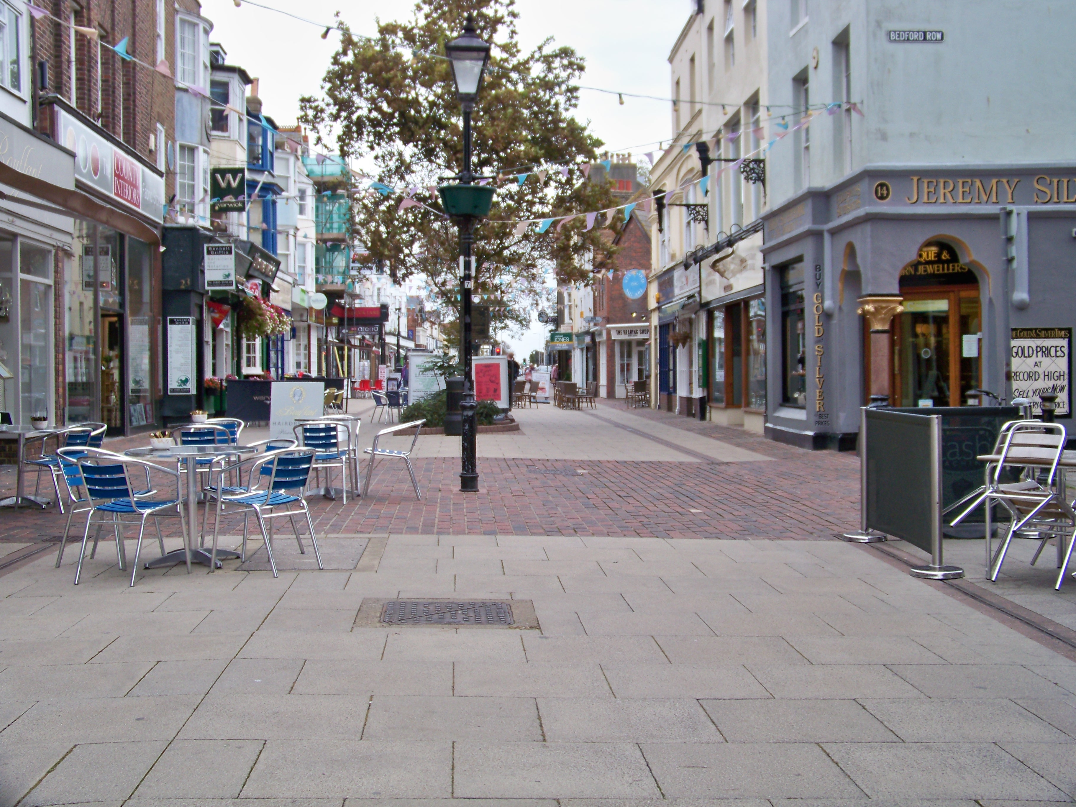Here above is Bedford House (larger and cream faced) and Stanford Cottage, Warwick Street, photographed in 1907 (reproduced with kind permission of West Sussex County Council Library Service) which can be compared to the new Pizza Express Restaurant it has become, shown here: [behind the tree]: