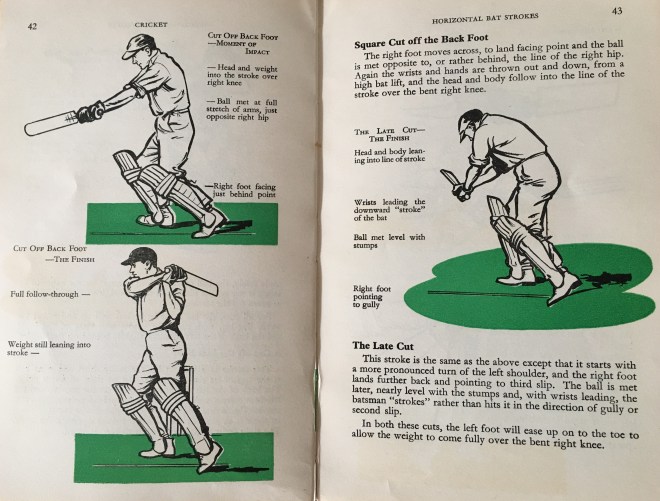 When I was seven years old my father bought me a cricket bat. He also bought this book for me, Approach to the Game: CRICKET_HOW TO PLAY, published for the M.C.C [Marylebone Cricket Club] 1955. It had some clear illustrations in it so I could analyse how to play certain skills.