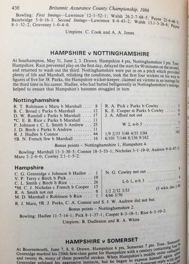 Here are two pages to provide you with a flavour of this annual almanac.A report on the Hampshire v Nottinghamshire match, played between May 31 and the 2nd and 3rd of June 1986 with a report and the statistics. Also I have included the opening part of a biographical piece on the great England and Surrey player Jim Laker. I met Jim Laker once when he came to visit Thames Ditton Cricket Club on Giggs Hill green near Surbiton. It was the Thames Ditton Cricket clubs 100th anniversary and he was invited to our celebrations. He readily helped me do some coaching with the colts before the senior game commenced. I was not only a player at the club at the time but the youth team coach and manager. He offered to umpire in the main match of the day. He was a lovely warm character and we were all in awe of him. In 1956 Jim Laker not only took 10 Australian wickets when Australia played Surrey at the Oval he also decimated the Australians at Old Trafford Test match bowing 19 wickets in the two innings. He has been regarded as the best England bowler ever. He was a right arm off break bowler.