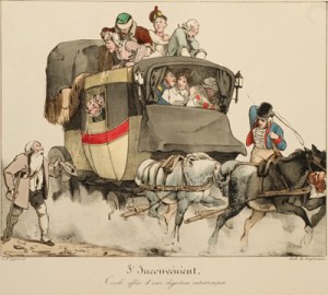 [image from the book: LePrince, Xavier. Inconvéniens d’un Voyage en Diligence. Douze Tableaux, Lithographiés par…Paris: Chez Gihaut Freres… et Sazerac et Duval, 1826]