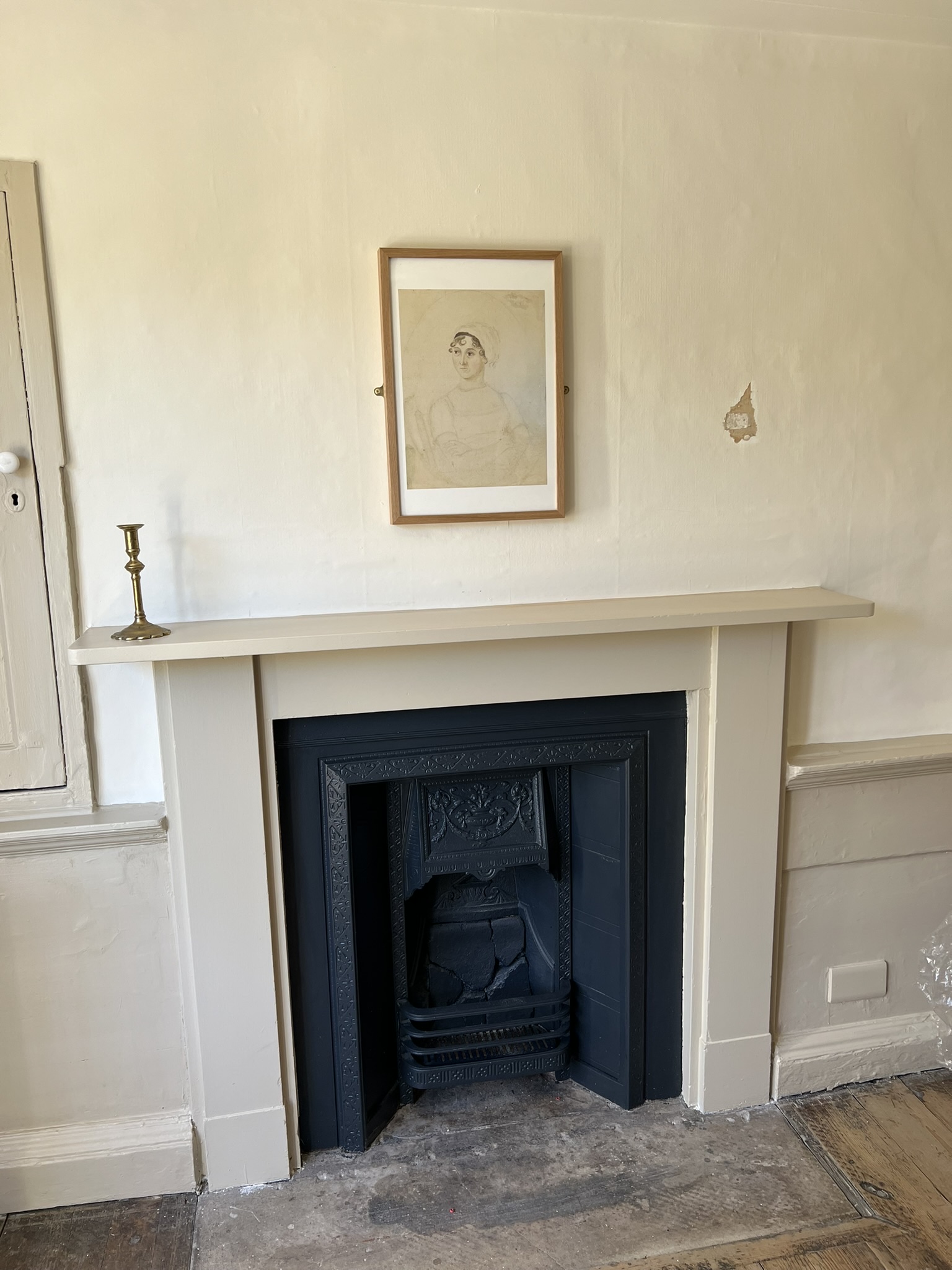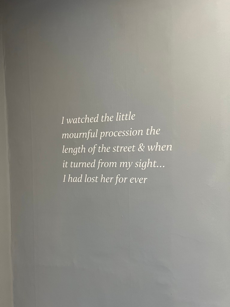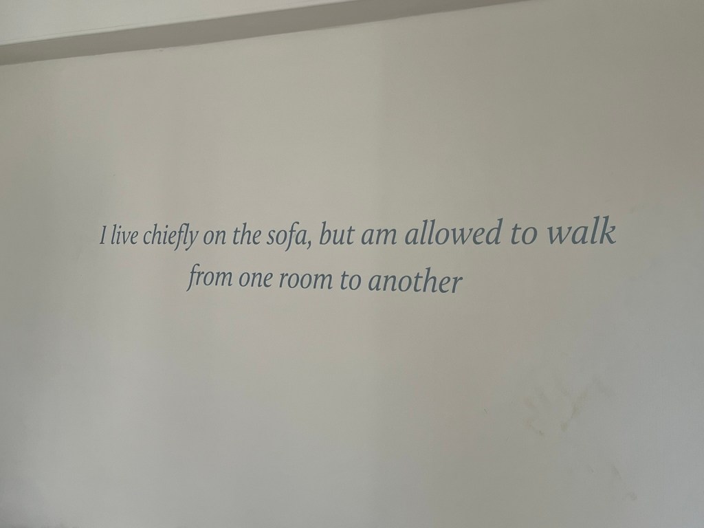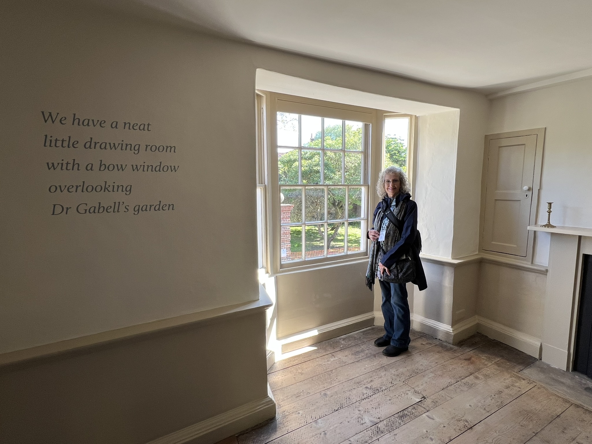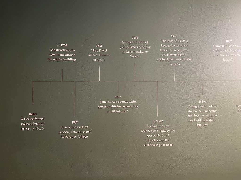 What a wonderful and unexpected surprise to find that the College, who owns the building, had just the day before put some of the finishing touches on the house, readying it for the onslaught of Jane people in this 250th anniversary year. They had literally just finished painting some of the wall signs and quotations just the day before, and while the restoration is still ongoing, this very welcome gift to us on the JASNA tour is too much to put into words. I have been to this house before a couple of times, standing across the street and looking longingly at the spot where Austen spent her last weeks – but to go inside and see the interior walls, painted now as they were in her time, was so much more emotional than I expected [this now just edging out my seeing where Keats* died in Rome as the saddest literary moment I’ve experienced…]