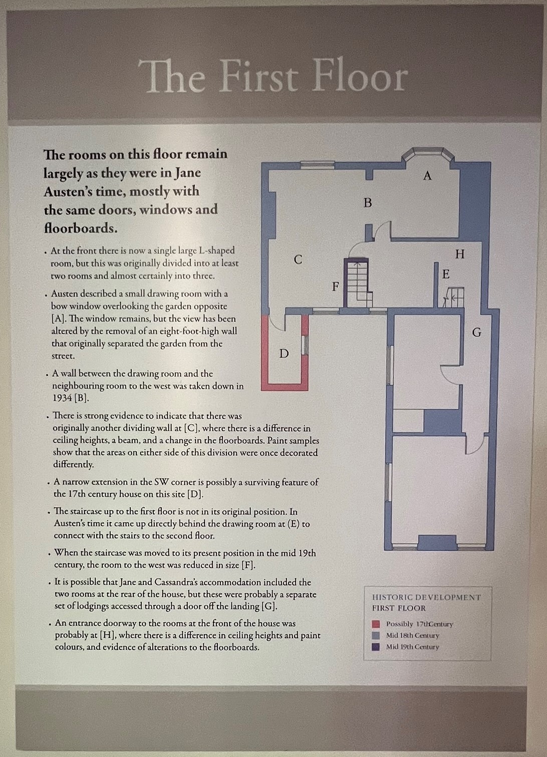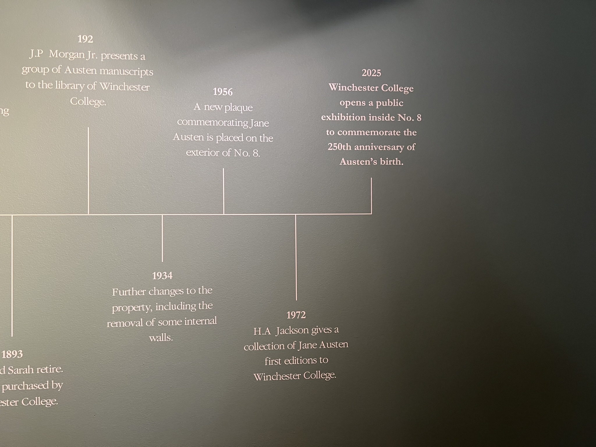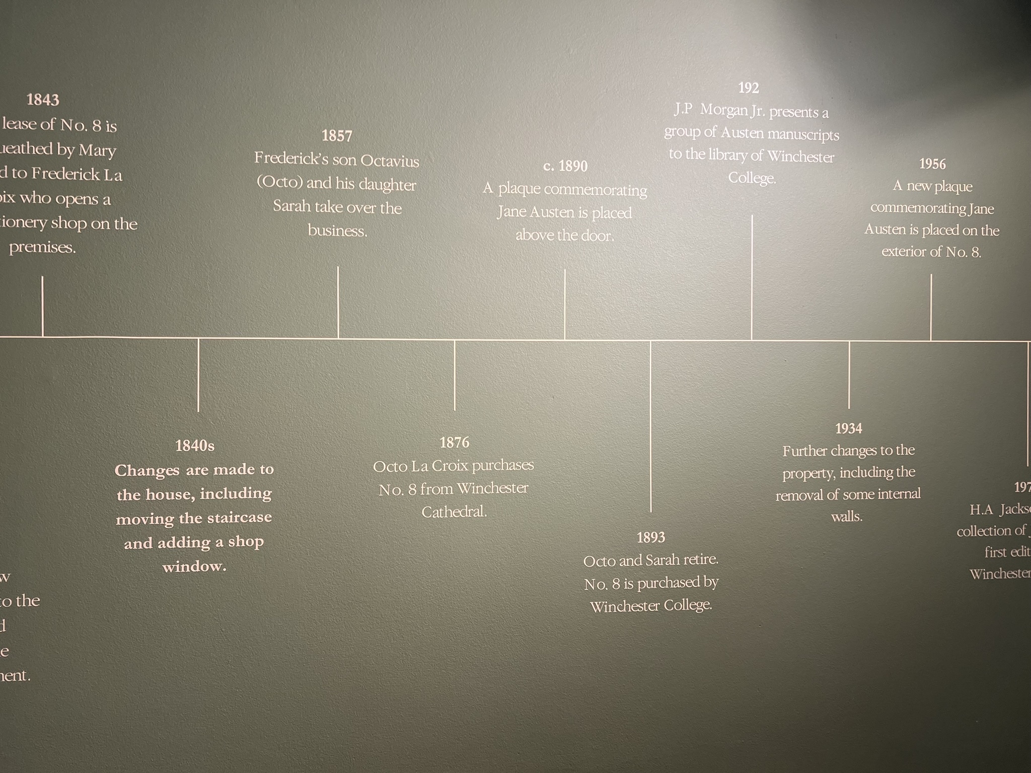 What a wonderful and unexpected surprise to find that the College, who owns the building, had just the day before put some of the finishing touches on the house, readying it for the onslaught of Jane people in this 250th anniversary year. They had literally just finished painting some of the wall signs and quotations just the day before, and while the restoration is still ongoing, this very welcome gift to us on the JASNA tour is too much to put into words. I have been to this house before a couple of times, standing across the street and looking longingly at the spot where Austen spent her last weeks – but to go inside and see the interior walls, painted now as they were in her time, was so much more emotional than I expected [this now just edging out my seeing where Keats* died in Rome as the saddest literary moment I’ve experienced…]