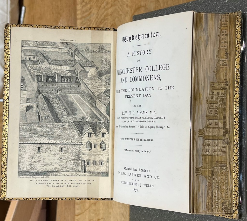 a book on the history of the College with a fantastic fore-edge painting of the College [for more information on fore-edge paintings, visit here – and here – an exhibition at the Lilly Library.]
