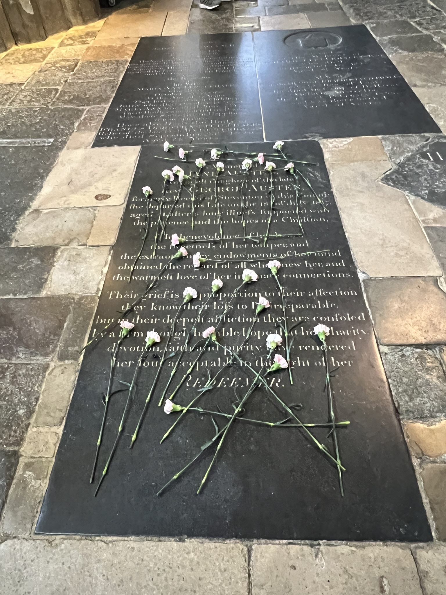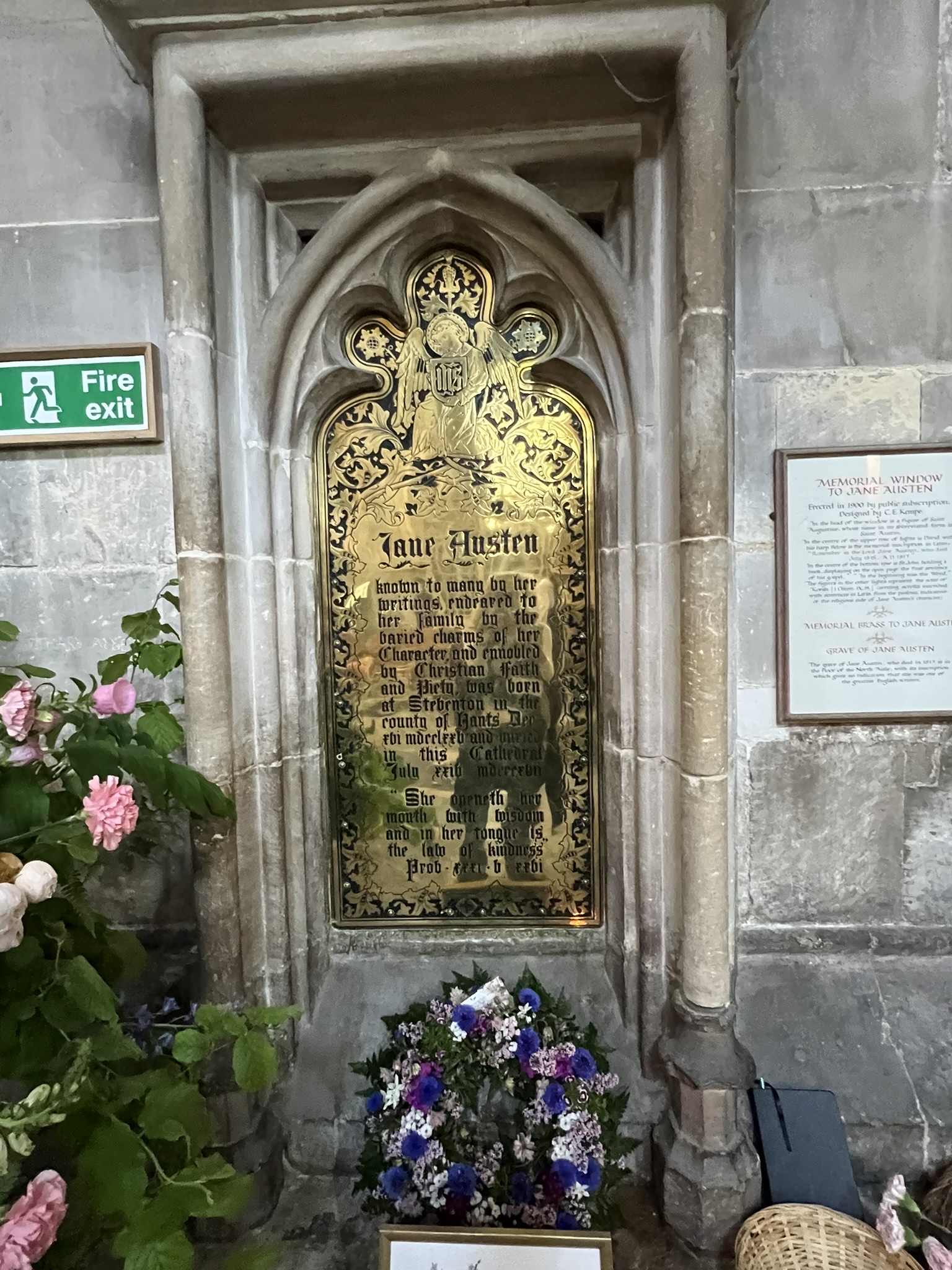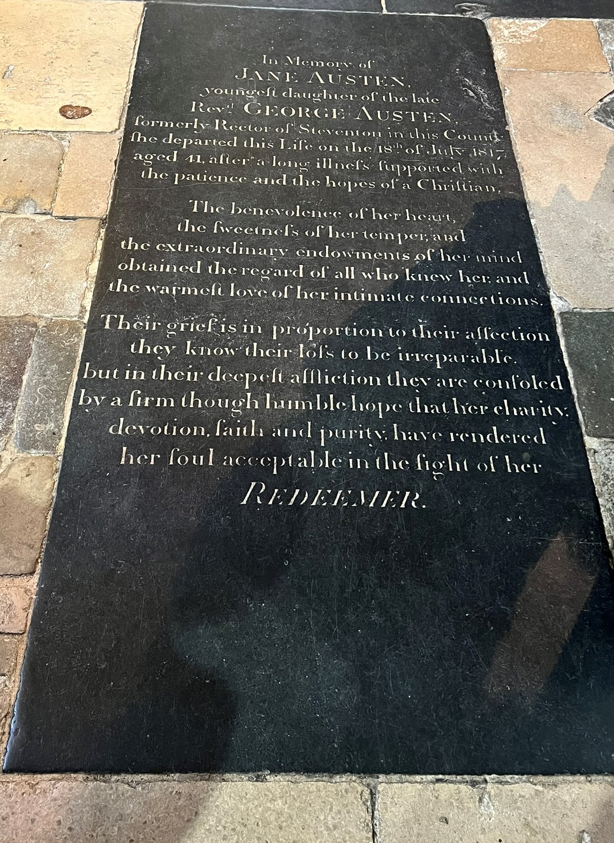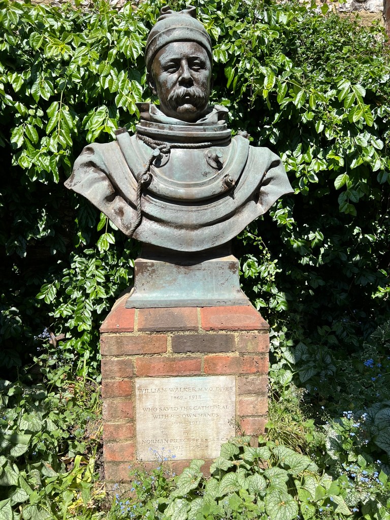 During lunch at the Cathedral café I found this monument to William Walker, known affectionately as “Diver Bill” – “The diver who with his own hands saved Winchester Cathedral.” Nothing to do with Jane, but good to know the building which holds her tomb is safe from disintegrating…