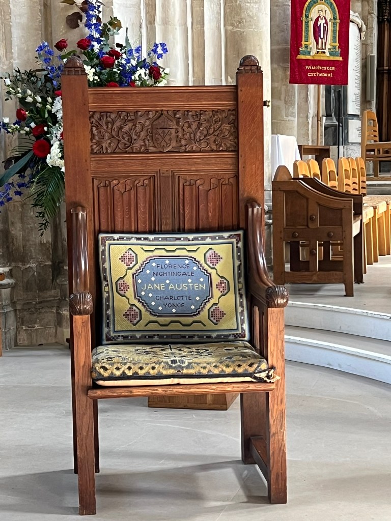 We were then sent off on our own to explore the Cathedral as we chose, so I just wandered around for a bit to find this kneeler by the author Tracy Chevalier memorializing Hampshire women (Florence Nightingale, Charlotte Yonge, and Jane Austen):