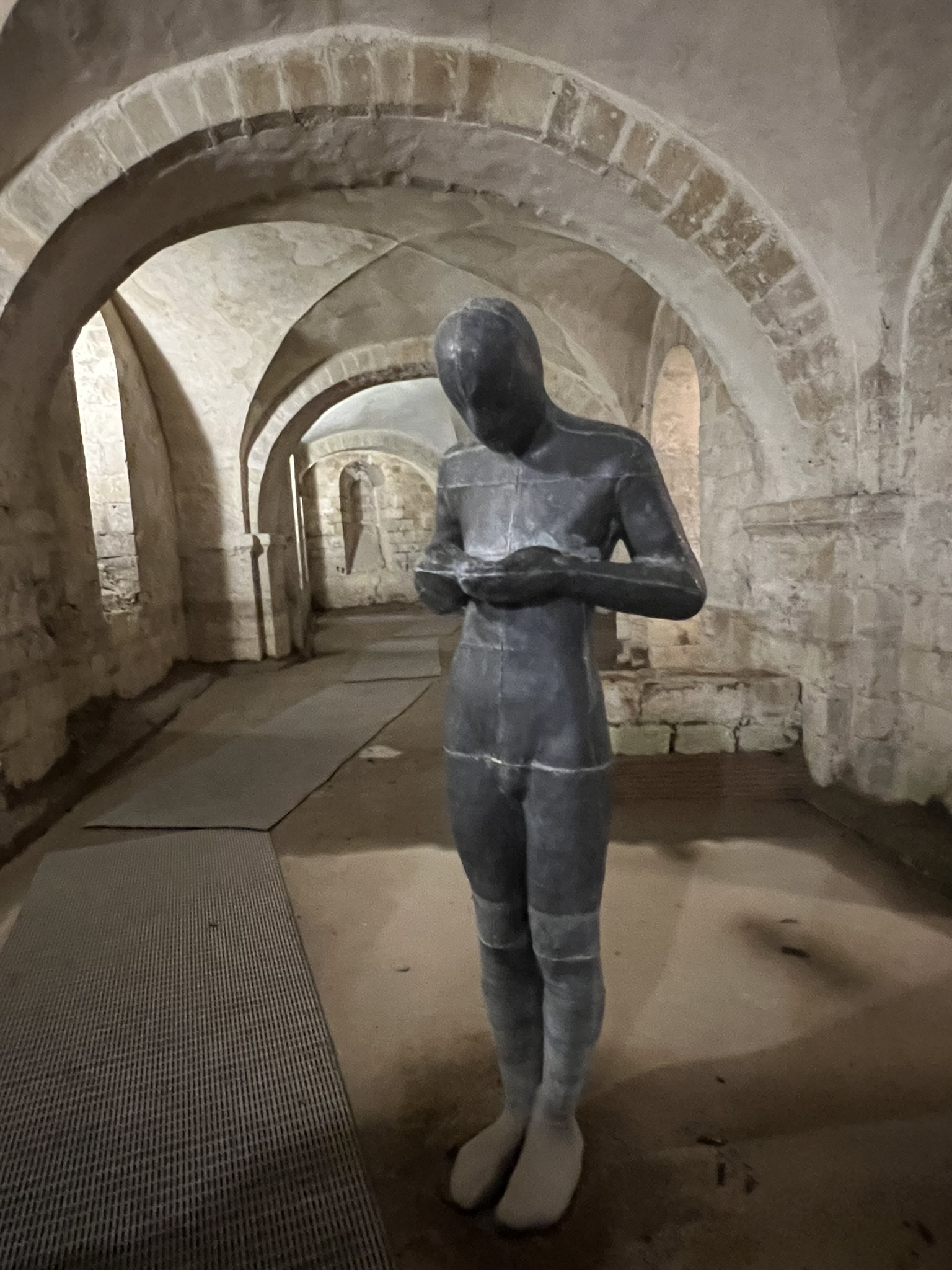 Even more interesting was to find that the entire Cathedral at one point risked collapsing because of how the water table rose to such heights in the crypt that it was only a matter of time until it all fell down – an amazing story of one man, William Walker, an experienced diver who would spend several years diving below the surface and reinforcing the foundation with concrete – today the water still rises in the crypt and you can see the levels on the walls – along with this very modern sculpture “Sound II” by Antony Gormley that periodically finds itself knee-deep in water as well as actually holding water in his cupped hands… :