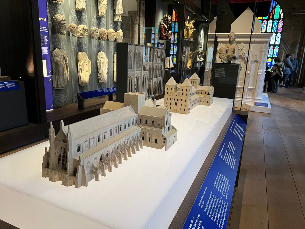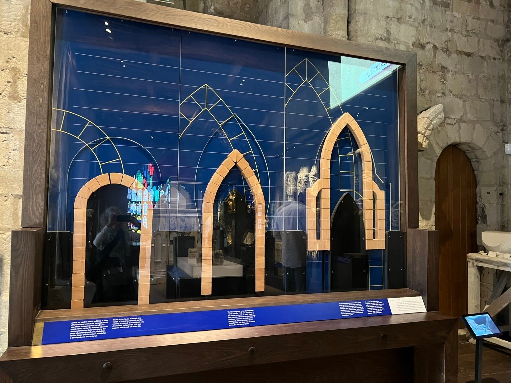 The Cathedral exhibition “Kings and Scribes: Birth of a Nation” tells the over 1,000 year history of Britain with many treasures, as well as this nicely done explanation of the architectural differences through the ages:
